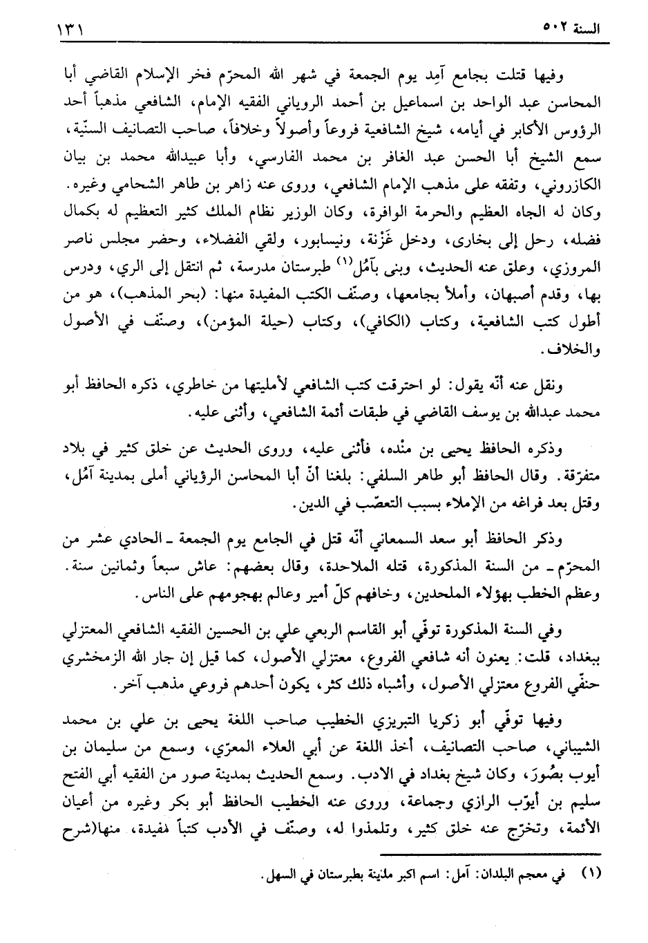 وفيها قتلت بجامع آمد يوم الجمعة في شهر الله المحرم فخر الإسلام القاضي أبا المحاسن عبد الواحد بن اسماعيل بن أحمد الروياني الفقيه الإمام، الشافعي مذهباً أحد الرؤوس الأكابر في أيامه، شيخ الشافعية فروعاً وأصولاً وخلافاً، صاحب التصانيف السنية، سمع الشيخ أبا الحسن عبد الغافر بن محمد الفارسي، وأبا عبيد الله محمد بن بيان الكازروني، وتفقه على مذهب الإمام الشافعي، وروى عنه زاهر بن طاهر الشحامي وغيره. وكان له الجاه العظيم والحرمة الوافرة، وكان الوزير نظام الملك كثير التعظيم له بكمال فضله، رحل إلى بخارى، ودخل غزنة، ونيسابور، ولقي الفضلاء، وحضر مجلس ناصر المروزي، وعلق عنه الحديث، وبنى بآمل طبرستان مدرسة، ثم انتقل إلى الري، ودرس بها، وقدم أصبهان، وأملأ بجامعها، وصنف الكتب المفيدة منها: بحر المذهب، هو من أطول كتب الشافعية، وكتاب الكافي، وكتاب حيلة المؤمن، وصنف في الأصول والخلاف. ونقل عنه أنه يقول: لو احترقت كتب الشافعي لأمليتها من خاطري، ذكره الحافظ أبو محمد عبد الله بن يوسف القاضي في طبقات أئمة الشافعي، وأثنى عليه. وذكره الحافظ يحيى بن منده، فأثنى عليه، وروى الحديث عن خلق كثير في بلاد متفزقة. وقال الحافظ أبو طاهر السلفي: بلغنا أن أبا المحاسن الرؤياني أملى بمدينة آمل، وقتل بعد فراغه من الإملاء بسبب التعصب في الدين. وذكر الحافظ أبو سعد السمعاني أنه قتل في الجامع يوم الجمعة - الحادي عشر من المحرم - من السنة المذكورة، قتله الملاحمة، وقال بعضهم: عاش سبعاً وثمانين سنة. وعظم الخطب بهؤلاء الملحدين، وخافهم كل أمير وعالم بهجومهم على الناس. وفي السنة المذكورة توفي أبو القاسم الربعي علي بن الحسين الفقيه الشافعي المعتزلي ببغداد، قلت: يعنون أنه شافعي الفروع، معتزلي الأصول، كما قيل إن جار الله الزمخشري حنفي الفررع معتزلي الأصول، وأشباه ذلك كثر، يكون أحدهم فروعي مذهب آخر. وفيها توفي أبو زكريا التبريزي الخطيب صاحب اللغة يحيى بن علي بن محمد الشيباني، صاحب التصانيف، أخذ اللغة عن أبي العلاء المعري، وسمع من سليمان بن أيوب بصور، وكان شيخ بغداد في الادب. وسمع الحديث بمدينة صور من الفقيه أبي الفتح سليم بن أيوب الرازي وجماعة، وروى عنه الخطيب الحافظ أبو بكر وغيره من أعيان الأئمة، وتخرج عنه خلق كثير، وتلمذوا له، وصنف في الأدب كتباً مفيدة، منها شرح