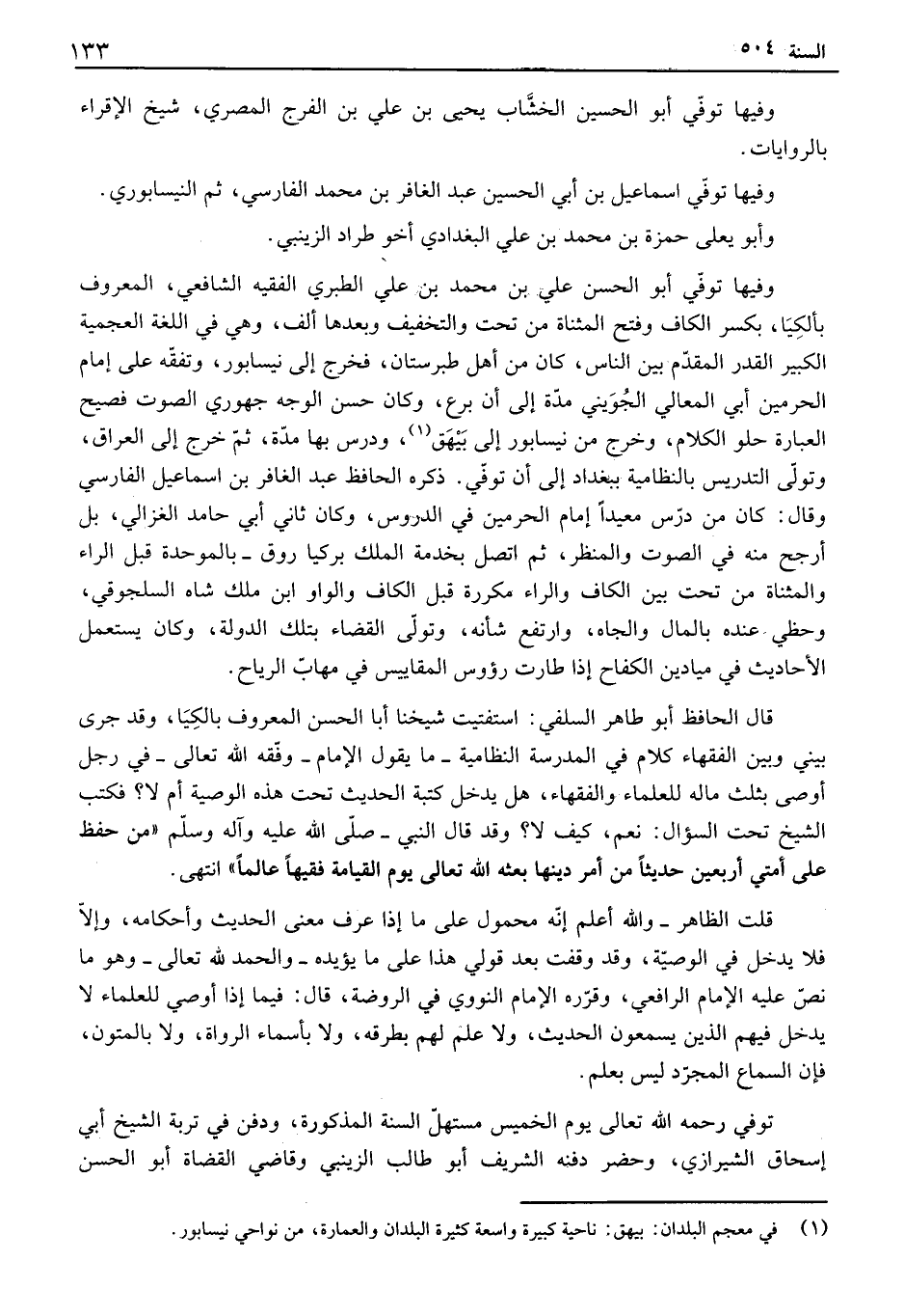 وفيها توفي أبو الحسين الخشاب يحيى بن علي بن الفرج المصري، شيخ الإقراء با لروايات. وفيها توفي اسماعيل بن أبي الحسين عبد الغافر بن محمد الفارسي، ثم النيسابوري. وأبو يعلى حمزة بن محمد بن علي البغدادي أخو طراد الزينبي. وفيها توفي أبو الحسن علي بن محمد بن علي الطبري الفقيه الشافعي، المعروف بألكيا، بكسر الكاف وفتح المثناة من تحت والتخفيف وبعدها ألف، وهي في اللغة العجمية الكبير القدر المقدم بين الناس، كان من أهل طبرستان، فخرج إلى نيسابور، وتفقه على إمام الحرمين أبي المعالي الجويني مدة إلى أن برع، وكان حسن الوجه جهوري الصوت فصيح العبارة حلو الكلام، وخرج من نيسابور إلى بيهق، ودرس بها مدة، ثم خرج إلى العراق، وتولى التدريس بالنظامية ببغداد إلى أن توفي. ذكره الحافظ عبد الغافر بن اسماعيل الفارسي وقال: كان من درس معيداً إمام الحرمين في الدروس، وكان ثاني أبي حامد الغزالي، بل أرجح منه في الصوت والمنظر، ثم اتصل بخدمة الملك بركيا روق - بالموحدة قبل الراء والمثناة من تحت بين الكاف والراء مكررة قبل الكاف والواو ابن ملك شاه السلجوقي، وحظي عنده بالمال والجاه، وارتفع شأنه، وتولى القضاء بتلك الدولة، وكان يستعمل الأحاديث في ميادين الكفاح إذا طارت رؤوس المقاييس في مهاب الرياح. قال الحافظ أبو طاهر السلفي: استفتيت شيخنا أبا الحسن المعروف بالكيا، وقد جرى بيني وبين الفقهاء كلام في المدرسة النظامية - ما يقول الإمام - وفقه الله تعالى - في رجل أوصى بثلث ماله للعلماء والفقهاء، هل يدخل كتبة الحديث تحت هذه الوصية أم لا؟ فكتب الشيخ تحت السؤال: نعم، كيف لا؟ وقد قال النبي - صلى الله عليه وآله وسلم " من حفظ على أمتي أربعين حديثاً من أمر دينها بعثه الله تعالى يوم القيامة فقيهاً عالماً " انتهى. قلت الظاهر - والله أعلم إنه محمول على ما إذا عرف معنى الحديث وأحكامه، وإلا فلا يدخل في الوصية، وقد وقفت بعد قولي هذا على ما يؤيده - والحمد لله تعالى - وهو ما نص عليه الإمام الرافعي، وقرره الإمام النووي في الروضة، قال: فيما إذا أوصي للعلماء لا يدخل فيهم الذين يسمعون الحديث، ولا علم لهم بطرقه، ولا بأسماء الرواة، ولا بالمتون، فإن السماع المجرد ليس بعلم. توفي رحمه الله تعالى يوم الخميس مستهل السنة المذكورة، ودفن في تربة الشيخ أبي إسحاق الشيرازي، وحضر دفنه الشريف أبو طالب الزينبي وقاضي القضاة أبو الحسن