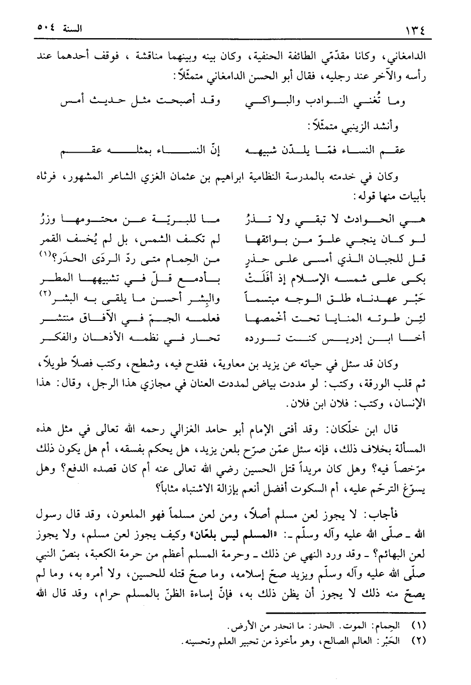 الدامغاني، وكانا مقدمي الطائفة الحنفية، وكان بينه وبينهما مناقشة، فوقف أحدهما عند رأسه والآخر عند رجليه، فقال أبو الحسن الدامغاني متمثلا: