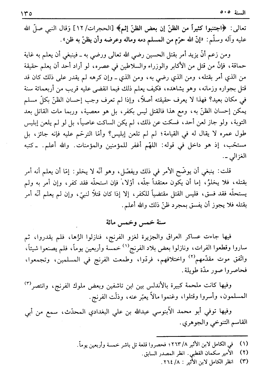 تعالى: " اجتنبوا كثيراً من الظن إن بعض الظن إثم " - الحجرات 12 - وقال النبي صل الله عليه وآله وسلم: " إن الله حرم من المسلم دمه وماله وعرضه وأن يظن به ظن ". ومن زعم أن يزيد أمر بقتل الحسين رضي الله تعالى ورضي به - فينبغي أن يعلم به غاية حماقة، فإن من قتل من الأكابر والوزراء والسلاطين في عصره، لو أراد أحد أن يعلم حقيقة من الذي أمر بقتله، ومن الذي رضي به، ومن الذي - وإن كرهه لم يقدر على ذلك كان قد قتل بجواره وزمانه، وهو يشاهده، فكيف يعلم ذلك فيما أنقضى عليه قريب من أربعمائة سنة في مكان بعيد؟ فهذا لا يعرف حقيقته أصلا، وإذا لم تعرف وجب إحسان الظن بكل مسلم يمكن إحسان الظن به، ومع هذا فالقتل ليس بكفر، بل هو معصية، وربما مات القاتل بعد التوبة، ولو جاز لعن أحد، فسكت عن ذلك، لم يكن الساكت عاصياً، بل لو لم يلعن إبليس طول عمره لا يقال له في القيامة؛ لم لم تلعن إبليس؟ وأما الترحم عليه فإنه جائز، بل مستحب، إذ هو داخل في قوله: اللهم أغفر للمؤمنين والمؤمنات. والله أعلم. - كتبه الغزالي -. قلت: ينبغي أن يوضح الأمر في ذلك ويفصل، وهو أنه لا يخلو: إما أن يعلم أنه أمر بقتله، فلا يخلو، إما أن يكون معتقداً جله، أولا، فإن استحله فقد كفر، وإن أمر به ولى يستحله فقد فسق، فليس القتل مقتضياً للكفر، إلا إذا كان قتلاً لنبي، وإن لم يعلم أنه أمر بقتله فلا يجوز أن يفسق بمجرد ظن ذلك والله أعلم.