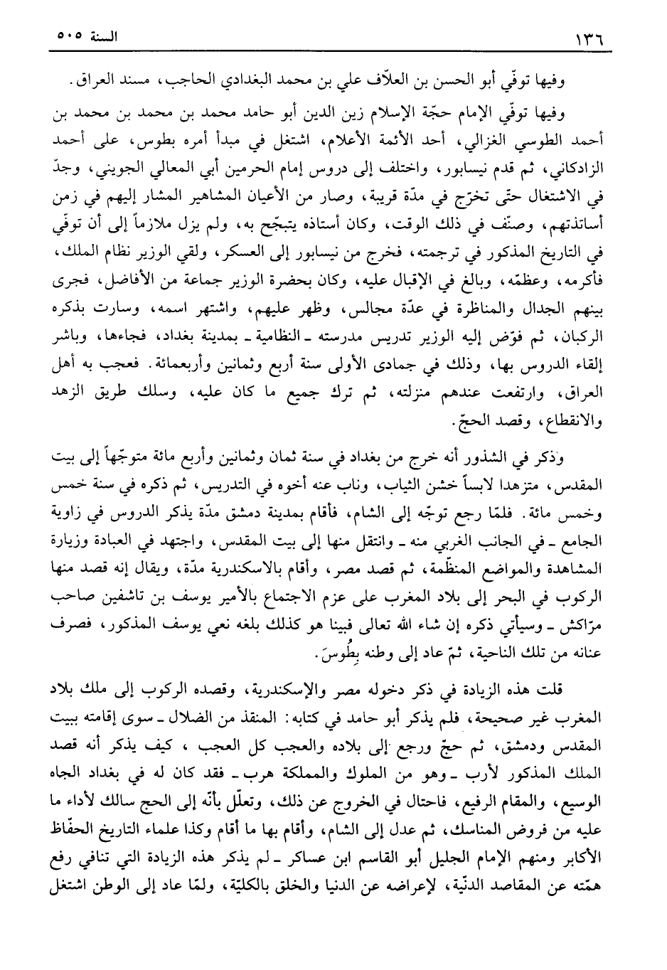 وفيها توفي أبو الحسن بن العلاف علي بن محمد البغدادي الحاجب، مسند العراق. وفيها توفي الإمام حجة الإسلام زين الدين أبو حامد محمد بن محمد بن محمد بن أحمد الطوسي الغزالي، أحد الأئمة الأعلام، اشتغل في مبدأ أمره بطوس، على أحمد الزادكاني، ثم قدم نيسابور، واختلف إلى دروس إمام الحرمين أبي المعالي الجويني، وجد في الاشتغال حتى تخزج في مدة قريبة، وصار من الأعيان المشاهير المشار إليهم في زمن أساتذتهم، وصنف في ذلك الوقت، وكان أستاذه يتبجح به، ولم يزل ملازماً إلى أن توفي في التاريخ المذكور في ترجمته، فخرج من نيسابور إلى العسكر، ولقي الوزير نظام الملك، فأكرمه، وعظمه، وبالغ في الإقبال عليه، وكان بحضرة الوزير جماعة من الأفاضل، فجرى بينهم الجدال والمناظرة في عدة مجالس، وظهر عليهم، واشتهر اسمه، وسارت بذكره الركبان، ثم فوض إليه الوزير تدريس مدرسته - النظامية - بمدينة بغداد، فجاءها، وباشر إلقاء الدروس بها، وذلك في جمادى الأولى سنة أربع وثمانين وأربعمائة. فعجب به أهل العراق، وارتفعت عندهم منزلته، ثم ترك جميع ما كان عليه، وسلك طريق الزهد والانقطاع، وقصد الحج. وذكر في الشذور أنه خرج من بغداد في سنة ثمان وثمانين وأربع مائة متوجهاً إلى بيت المقدس، متزهداً لابساً خشن الثياب، وناب عنه أخوه في التدريس، ثم ذكره في سنة خمس وخمس مائة. فلما رجع توجه إلى الشام، فأقام بمدينة دمشق مدة يذكر الدروس في زاوية الجامع - في الجانب الغربي منه - وانتقل منها إلى بيت المقدس، واجتهد في العبادة وزيارة المشاهدة والمواضع المنظمة، ثم قصد مصر، وأقام بالاسكندرية مدة، ويقال إنه قصد منها الركوب في البحر إلى بلاد المغرب على عزم الاجتماع بالأمير يوسف بن تاشفين صاحب مراكش - وسيأتي ذكره إن شاء الله تعالى فبينا هو كذلك بلغه نعي يوسف المذكور، فصرف عنانه من تلك الناحية، ثم عاد إلى وطنه بطوس. قلت هذه الزيادة في ذكر دخوله مصر والإسكندرية، وقصده الركوب إلى ملك بلاد المغرب غير صحيحة، فلم يذكر أبو حامد في كتابه: المنقذ من الضلال - سوى إقامته ببيت المقدس ودمشق، ثم حج ورجع إلى بلاده والعجب كل العجب، كيف يذكر أنه قصد الملك المذكور لأرب - وهو من الملوك والمملكة هرب - فقد كان له في بغداد الجاه الوسيع، والمقام الرفيع، فاحتال في الخروج عن ذلك، وتعلل بأنه إلى الحج سالك لأداء ما عليه من فروض المناسك، ثم عدل إلى الشام، وأقام بها ما أقام وكذا علماء التاريخ الحفاظ الأكابر ومنهم الإمام الجليل أبو القاسم ابن عساكر - لم يذكر هذه الزيادة التي تنافي رفع همته عن المقاصد الدنية، لإعراضه عن الدنيا والخلق بالكلية، ولما عاد إلى الوطن اشتغل