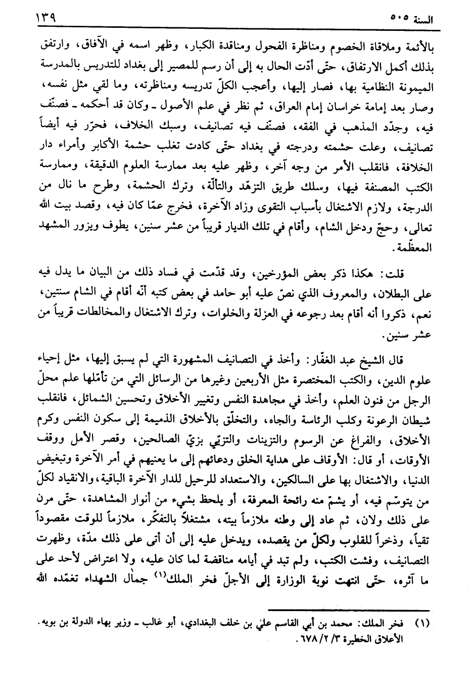بالأئمة وملاقاة الخصوم ومناظرة الفحول ومناقدة الكبار، وظهر اسمه في الآفاق، وارتفق بذلك أكمل الارتفاق، حتى أدت الحال به إلى أن رسم للمصير إلى بغداد للتدريس بالمدرسه الميمونة النظامية بها، فصار إليها، وأعجب الكل تدريسه ومناظرته، وما لقي مثل نفسه، وصار بعد إمامة خراسان إمام العراق، ثم نظر في علم الأصول - وكان قد أحكمه - فصنف فيه، وجدد المذهب في الفقه، فصنف فيه تصانيف، وسبك الخلاف، فحرر فيه أيضاً تصانيف، وعلت حشمته ودرجته في بغداد حتى كادت تغلب حشمة الأكابر وأمراء دار الخلافة، فانقلب الأمر من وجه آخر، وظهر عليه بعد ممارسة العلوم الدقيقة، وممارسة الكتب المصنفة فيها، وسلك طريق التزهد والتألة، وترك الحشمة، وطرح ما نال من الدرجة، ولازم الاشتغال بأسباب التقوى وزاد الآخرة، فخرج عما كان فيه، وقصد بيت الله تعالى، وحج ودخل الشام، وأقام في تلك الديار قريباً من عشر سنين، يطوف ويزور المشهد المعظمة. قلت: هكذا ذكر بعض المؤرخين، وقد قدمت في فساد ذلك من البيان ما يدل فيه على البطلان، والمعروف الذي نص عليه أبو حامد في بعض كتبه أنه أقام في الشام سنتين، نعم، ذكروا أنه أقام بعد رجوعه في العزلة والخلوات، وترك الاشتغال والمخالطات قريباً من عثسرسنين. قال الشيخ عبد الغفار: وأخذ في التصانيف المشهورة التي لم يسبق إليها، مثل إحياء علوم الدين، والكتب المختصرة مثل الأربعين وغيرها من الرسائل التي من تأملها علم محل الرجل من فنون العلم، وأخذ في مجاهدة النفس وتغيير الأخلاق وتحسين الشمائل، فانقلب شيطان الرعونة وكلب الرئاسة والجاه، والتخلق بالأخلاق الذميمة إلى سكون النفس وكرم الأخلاق، والفراغ عن الرسوم والتزينات والتزيي بزي الصالحين، وقصر الأمل ووقف الأوقات، أو قال: الأوقاف على هداية الخلق ودعائهم إلى ما يعنيهم في أمر الآخرة وتبغيض الدنيا، والاشتغال بها على السالكين، والاستعداد للرحيل للدار الآخرة الباقية، والانقياد لكل من يتوسم فيه، أو يشم منه رائحة المعرفة، أو يلحظ بشيء من أنوار المشاهدة، حتى مرن على ذلك ولان، ثم عاد الى وطنه ملازماً بيته، مشتغلاً بالتفكر، ملازماً للوقت مقصوداً تقياً، وذخراً للقلوب ولكل من يقصده، ويدخل عليه إلى أن أتى على ذلك مدة، وظهرت التصانيف، وفشت الكتب، ولم تبد في أيامه مناقضة لما كان عليه، ولا اعتراض لأحد على ما آثره، حتى انتهت نوبة الوزارة إلى الأجل فخر الملك جمال الشهداء تغمده الله