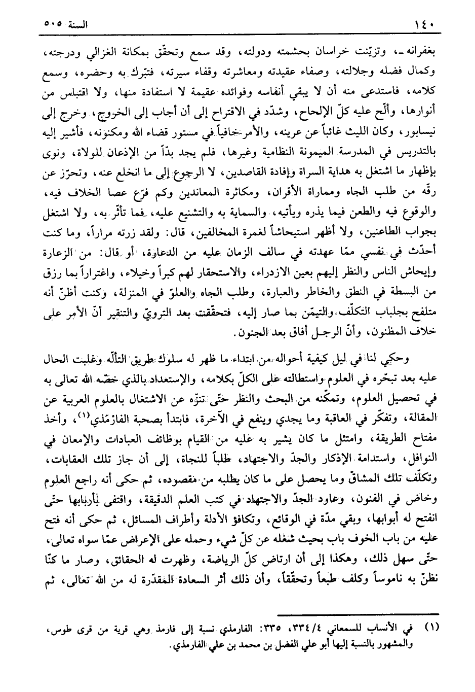 من الدعارة، أو قال: من الزعارة وإيحاش الناس والنظر إليهم بعين الازدراء، والاستحقار لهم كبراً وخيلاء، واغتراراً بما رزق من البسطة في النطق والخاطر والعبارة، وطلب الجاه والعلو في المنزلة، وكنت أظن أنه متلفح بجلباب التكلف والتيمن بما صار إليه، فتحققت بعد التروي والتنقير أن الأمر على خلاف المظنون، وأن الرجل أفاق بعد الجنون. من الدعارة، أو قال: من الزعارة وإيحاش الناس والنظر إليهم بعين الازدراء، والاستحقار لهم كبراً وخيلاء، واغتراراً بما رزق من البسطة في النطق والخاطر والعبارة، وطلب الجاه والعلو في المنزلة، وكنت أظن أنه متلفح بجلباب التكلف والتيمن بما صار إليه، فتحققت بعد التروي والتنقير أن الأمر على خلاف المظنون، وأن الرجل أفاق بعد الجنون.
