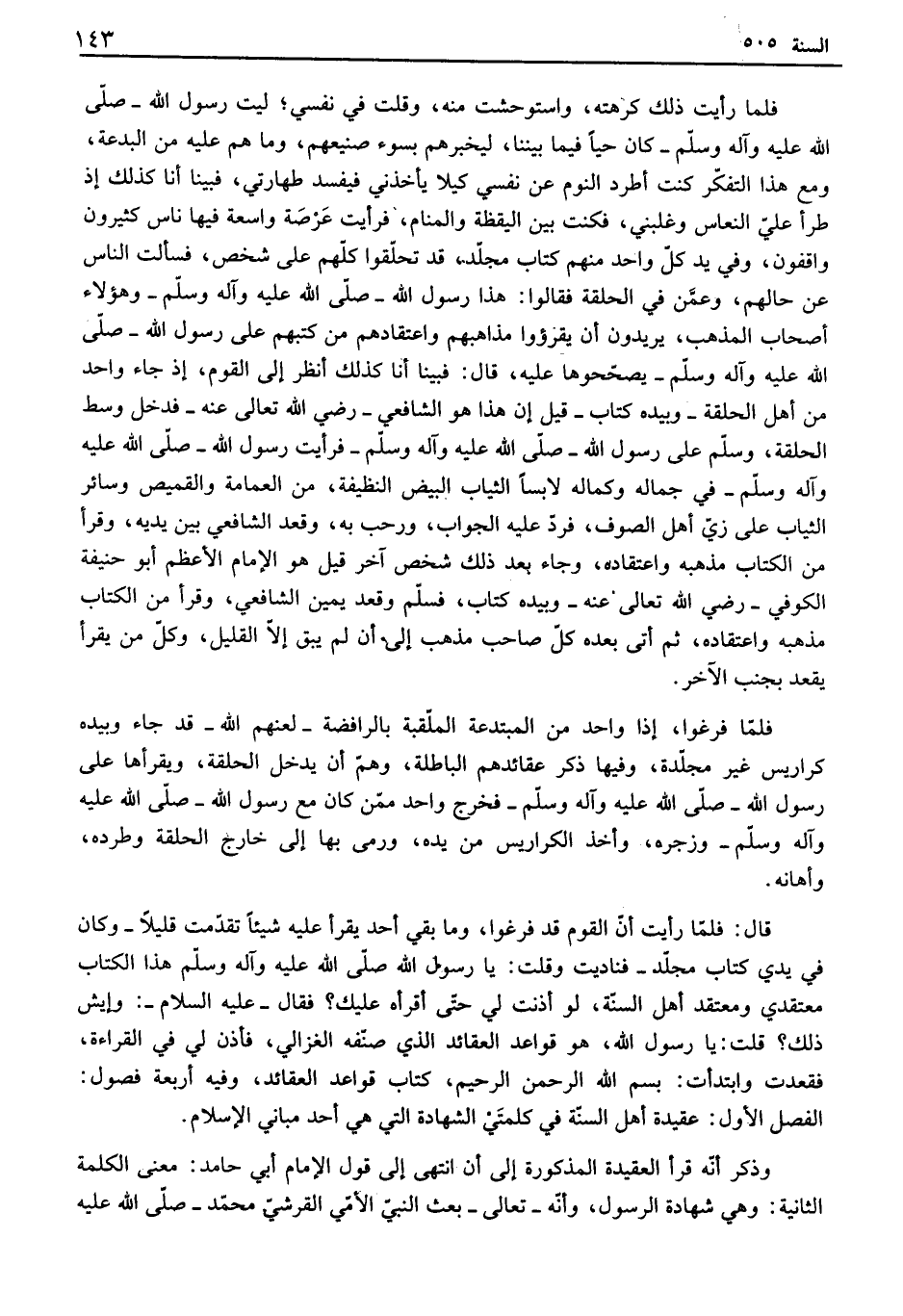 فلما رأيت ذلك كرهته، واستوحشت منه، وقلت في نفسي؛ ليت رسول الله - صلى الله عليه وآله وسلم - كان حياً فيما بيننا، ليخبرهم بسوء صنيعهم، وما هم عليه من البدعة ومع هذا التفكر كنت أطرد النوم عن نفسي كيلا يأخذني فيفسد طهارتي، فبينا أنا كذلك إذ طرأ علي النعاس وغلبني، فكنت بين اليقظة والمنام، فرأيت عرصة واسعة فيها ناس كثيرون واقفون، وفي يد كل واحد منهم كتاب مجلد، قد تحلقوا كلهم على شخص، فسألت الناس عن حالهم، وعمن في الحلقة فقالوا: هذا رسول الله - صلى الله عليه وآله وسلم - وهؤلا أصحاب المذهب، يريدون أن يقرؤوا مذاهبهم واعتقادهم من كتبهم على رسول الله - صلى الله عليه وآله وسلم - يصححوها عليه، قال: فبينا أنا كذلك أنظر إلى القوم، إذ جاء واحد من أهل الحلقة - وبيده كتاب - قيل إن هذا هو الشافعي - رضي الله تعالى عنه - فدخل وسط الحلقة، وسلم على رسول الله - صلى الله عليه وآله وسلم - فرأيت رسول الله - صلى الله على وآله وسلم - في جماله وكماله لابساً الثياب البيض النظيفة، من العمامة والقميص وسائر الثياب على زي أهل الصوف، فرد عليه الجواب، ورحب به، وقعد الشافعي بين يديه، وقرأ من الكتاب مذهبه واعتقاده، وجاء بعد ذلك شخص آخر قيل هو الإمام الأعظم أبو حنيفة الكوفي - رضي الله تعالى عنه - وبيده كتاب، فسلم وقعد يمين الشافعي، وقرأ من الكتاب مذهبه واعتقاده، ثم أتى بعده كل صاحب مذهب إلى أن لم يبق إلا القليل، وكل من يقرأ يقعد بجنب الآخر. فلما فرغوا، إذا واحد من المبتدعة الملقبة بالرافضة - لعنهم الله - قد جاء وبيده كراريس غير مجلدة، وفيها ذكر عقائدهم الباطلة، وهم أن يدخل الحلقة، ويقرأها على رسول الله - صلى الله عليه وآله وسلم - فخرج واحد ممن كان مع رسول الله - صلى الله عليه وآله وسلم - وزجره، وأخذ الكراريس من يده، ورمى بها إلى خارج الحلقة وطرده، وأهانه. قال: فلما رأيت أن القوم قد فرغوا، وما بقي أحد يقرأ عليه شيئاً تقدمت قليلاً - وكان