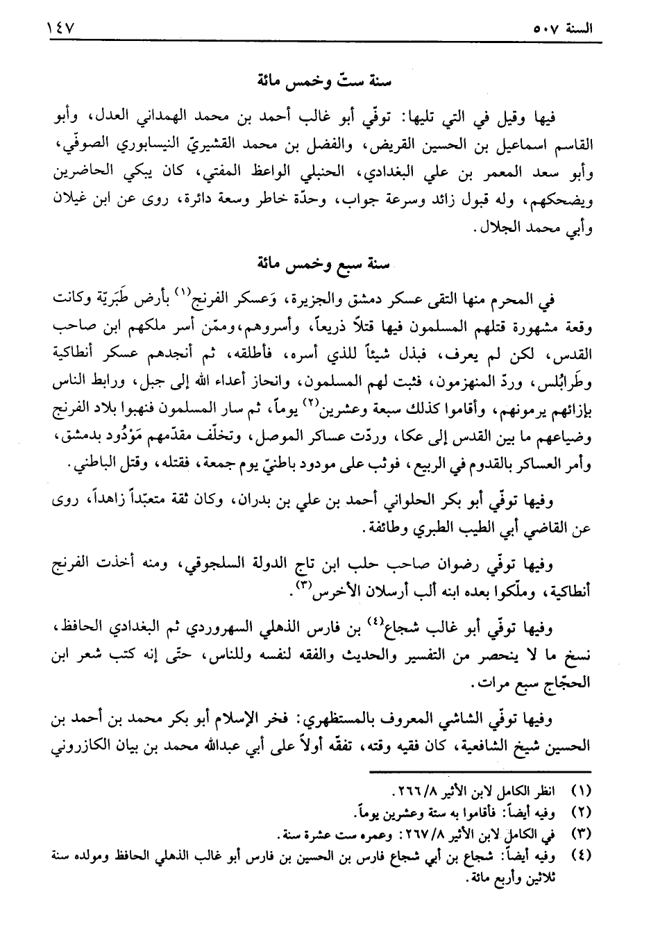 في المحرم منها التقى عسكر دمشق والجزيرة، وعسكر الفرنج بأرض طبرية وكانت وقعة مشهورة قتلهم المسلمون فيها قتلاً ذريعاً، وأسروهم، وممن أسر ملكهم ابن صاحب القدس، لكن لم يعرف، فبذل شيئاً للذي أسره، فأطلقه، ثم أنجدهم عسكر أنطاكية وطرابلس، ورد المنهزمون، فثبت لهم المسلمون، وانحاز أعداء الله إلى جبل، ورابط الناس بإزائهم يرمونهم، وأقاموا كذلك سبعة وعشرين يوماً، ثم سار المسلمون فنهبوا بلاد الفرنج وضياعهم ما بين القدس إلى عكا، وردت عساكر الموصل، وتخلف مقدمهم مودود بدمشق، وأمر العساكر بالقدوم في الربيع، فوثب على مودود باطني يوم جمعة، فقتله، وقتل الباطني. وفيها توفي أبو بكر الحلواني أحمد بن علي بن بدران، وكان ثقة متعبداً زاهداً، روى عن القاضي أبي الطيب الطبري وطائفة. وفيها توفي رضوان صاحب حلب ابن تاج الدولة السلجوقي، ومنه أخذت الفرنج أنطاكية، وملكوا بعده ابنه ألب أرسلان الأخرس. وفيها توفي أبو غالب شجاع بن فارس الذهلي السهروردي ثم البغدادي الحافظ، نسخ ما لا ينحصر من التفسير والحديث والفقه لنفسه وللناس، حتى إنه كتب شعر ابن الحجاج سبع مرات. وفيها توفي الشاشي المعروف بالمستظهري: فخر الإسلام أبو بكر محمد بن أحمد بن الحسين شيخ الشافعية، كان فقيه وقته، تفقه أولاً على أبي عبد الله محمد بن بيان الكازروني