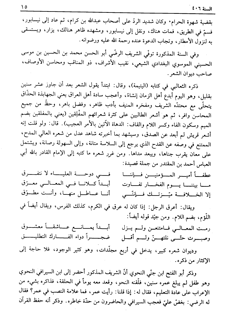 بقضية شهوة الحرام. وكان شديد الرد على أصحاب عبد الله بن كرام، ثم عاد إلى نيسابور، فسم في الطريق، فمات هناك، ونقل إلى نيسابور، ومشهده ظاهر هنالك، يزار، ويستسقى به لنزول الأمطار، وتجاب الدعوة عنده رحمة الله عليه ورضوانه. وفي السنة المذكورة توفي الشريف الرضي أبو الحسن محمد بن الحسين بن موسى الحسيني الموسوي البغدادي الشيعي، نقيب الأشراف، ذو المناقب ومحاسن الأوصاف، صاحب ديوان الشعر. ذكره الثعالبي في كتابه اليتيمة، وقال: ابتدأ يقول الشعر بعد أن جاوز عشر سنين بقليل، وهو اليوم أبدع أهل الزمان إنشاء، وأعجب سادة أهل العراق يعني الجهابذة الحذاق يتحلى مع محتده الشريف ومفخره المنيف بأدب ظاهر، وفضل باهر، وحظ من جميع المحاسن وافر، ثم هو أشعر الطالبين على كثرة شعرائهم المفلقين يعني بالمفلقين بضم الميم وسكون الفاء وكسر اللام والقاف: الدهاة الآتين بالأمر العجيب. قال: ولو قلت إنه أشعر قريش لم أبعد عن الصدق، وسيشهد بما أخبرته شاهد عدل من شعره العالي المدح، الممتنع في وصفه عن القدح الذي يرجع إلى السلاسة متانة، وإلى السهولة رصانة، ويشتمل على معان يقرب جناها، ويبعد مداها. ومن غرر شعره ما كتبه إلى الإمام القادر بالله أبي العباس أحمد بن المقتدر من جملة قصيدة: