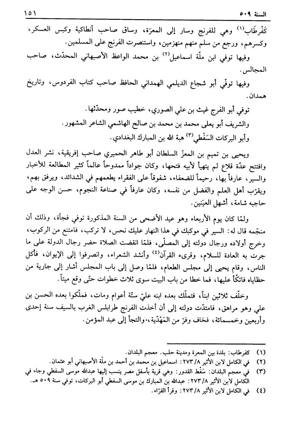 كفرطاب وهي للفرنج وسار إلى المعرة، وساق صاحب أنطاكية وكبس العسكر، وكسرهم، ورجع من سلم منهم منهزمين، واستنصرت الفرنج على المسلمين. وفيها توفي ابن ملة اسماعيل بن محمد الواعظ الأصبهاني المحدث، صاحب المجالس. وفيها توفي أبو شجاع الديلمي الهمداني الحافظ صاحب كتاب الفردوس، وتاريخ همدان. توفي أبو الفرج غيث بن علي الصوري، خطيب صور ومحدثها. والشريف أبو يعلى محمد بن محمد بن صالح الهاشمي الشاعر المشهور. وأبو البركات السفطي هبة الله بن المبارك البغدادي. ويحيى بن تميم بن المعز السلطان أبو طاهر الحميري صاحب إفريقية، نشر العدل وافتتح عدة قلاع لم يتهيأ لأبيه فتحها، وكان جواداً ممدوحاً عالماً كثير المطالعة للأخبار والسير، عارفاً بها، رحيماً للضعفاء، شفوقاً على الفقراء يطعمهم في الشدائد، ويرفق بهم، ويقرب أهل العلم والفضل من نفسه، وكان عارفاً في صناعة النجوم، حسن الوجه على حاجبه شامة، أشهل العينين. ولما كان يوم الأربعاء وهو عيد الأضحى من السنة المذكورة توفي فجأة، وذلك أن منجمه قال له: السير في موكبك في هذا النهار عليك نحس، لا تركب، فامتنع من الركوب، وخرج أولاده ورجال دولته إلى المصلى، فلما انقضت الصلاة حضر رجال الدولة على ما جرت به العادة للسلام، وقرىء القرآن وأنشد الشعراء، وانصرفوا إلى الإيوان، فأكل الناس، وقام يحيى إلى مجلس الطعام، فلما وصل إلى باب المجلس أشار إلى جارية من حظاياه فاتكأ عليها، فما خطا من باب البيت سوى ثلاث خطوات حتى وقع ميتاً. وخلف ثلاثين ابناً، فتملك بعده ابنه علي ستة أعوام ومات، فملكوا بعده الحسن بن علي وهو مراهق، فامتدت دولته إلى أن أخذت الفرنج طرابلس الغرب بالسيف سنة إحدى وأربعين وخمسمائة، فخاف وفز من المهدية،. والتجأ إلى عبد المؤمن.