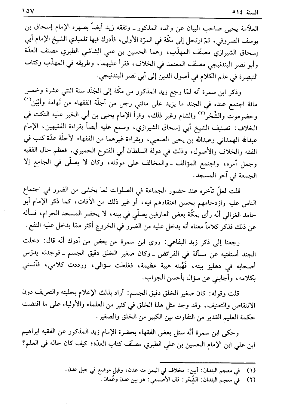 العلامة يحيى صاحب البيان عن والده المذكور - وتفقه زيد أيضاً بصهره الإمام إسحاق بن يوسف الصروفي، ثم ارتحل إلى مكة في المرة الأولى، فأدرك فيها تلميذي الشيخ الإمام أبي إسحاق الشيرازي مصنف المهذب، وهما الحسين بن علي الشاشي الطبري مصنف العدة وأبو نصر البندنيجي مصنف المعتمد في الخلاف، فقرأ عليهما، وطريقه في المهذب وكتاب التبصرة في علم الكلام في أصول الدين إلى أبي نصر البندنيجي. وذكر ابن سمرة أنه لما رجع زيد المذكور من مكة إلى الجند سنة اثنتي عشرة وخمس مائة اجتمع عنده في الجند ما يزيد على مائتي رجل من أجلة الفقهاء من تهامة وأبين وحضرموت والشحر والشام وغير ذلك، وقرأ الإمام يحيى بن أبي الخير عليه النكت في الخلاف: تصنيف الشيخ أبي إسحاق الشيرازي، وسمع عليه أيضاً بقراءة الفقيهين، الإمام عبد الله الهمداني وعبد الله بن يحيى الصعبي، وبقراءة غيرهما من الفقهاء الأجلة عدة كتب في الفقه والخلاف والأصول، وذلك في دولة السلطان أبي الفتوح الحميري، فعظم حال الفقيه وجمل أمره، واجتمع المؤالف - والمخالف على مودته، وكان لا يصلي في الجامع إلا الجمعة في آخر المسجد. قلت لعل تأخره عند حضور الجماعة في الصلوات لما يخشى من الضرر في اجتماع الناس عليه وازدحامهم بحسن اعتقادهم فيه، أو غير ذلك من الآفات، كما ذكر الإمام أبو حامد الغزالي أنه رأى بمكة بعض العارفين يصلي في بيته، لا يحضر المسجد الحرام، فسأله عن ذلك فذكر كلاماً معناه أنه يدخل عليه من الضرر في الخروج أكثر مما يدخل عليه النفع. رجعنا إلى ذكر زيد اليفاعي: روى ابن سمرة عن بعض من أدرك أنه قال: دخلت الجند أستفتيه عن مسألة في الفرائض - وكان صغير الخلق دقيق الجسم - فوجدته يدرس أصحابه في دهليز بيته، فهبته هيبة عظيمة، فغلطت سؤالي، ورددت كلامي، فآنسني بكلامه، وأجابني عن سؤال بأحسن الجواب. قلت وقوله: كان صغير الخلق دقيق الجسم: أراد بذلك الإعلام بحليته والتعريف دون الانتقاص والتعنيف، وقد وجد مثل هذا الخلق في كثير من العلماء والأولياء على ما اقتضت حكمة العليم القدير من التفاوت بين الكبير من الخلق والصغير. وحكى ابن سمرة أنه سئل بعض الفقهاء بحضرة الإمام زيد المذكور عن الفقيه ابراهيم ابن علي ابن الإمام الحسين بن علي الطبري مصنف كتاب العدة؛ كيف كان حاله في العلم؟