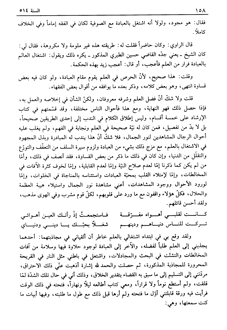 كان الشيخ - يعني جده القاضي حسين الطبري المذكور - يكره ذلك ويقول: اشتغال العالم بالعبادة فرار من العلم فأعجب، أو قال: أعجب زيد بهذه الحكمة. وقلت: هذا صحيح، لأن الحرص في العلم يقوم مقام العبادة، ولو كان فيه بعض قساوة انتهى، وهو بعض كلامه، وذكر بعده ما يوافقه من أقوال بعض الفقهاء. قلت ولا شك أن فضل العلم وشرفه معروفان، ولكن الشأن في إخلاصه والعمل به، فإذا حصل ذلك فهو النهاية، ومع هذا فأحوال الناس مختلفة، وقد قسمتهم في كتاب الإرشاد على خمسة أقسام، وليس إطلاق الكلام في الندب إلى إحدى الطريقين صحيحاً، بل لا بد من تفصيل، فمن كان له نية صحيحة في العلم ونجابة في الفهم، ولم يغلب عليه أحوال الرجال المشاهدين لنور الجمال، فلا شك أن هذا يندب له المبادرة وبذل المجهود في الاشتغال بالعلم، مع مزج ذلك بشيء من العبادة ولزوم سيرة السلف من التعفف والتورع والتقلل من الدنيا، وإن كان في ذلك ما ذكر من بعض القساوة، فقد أنصف في ذلك، وأما من لم يكن كما ذكرنا إما لعدم صلاح النية وإما لعدم القابلية، وإما لخوف كثرة الآفات في المخالطات، وإما لإمتلاء القلب بمحبة العبادات واستئناسه بالمناجاة في الخلوات، وإما لورود الأحوال ووجود المشاهدات، أعني مشاهدة نور الجمال واستيلاء هيبة العظمة والحلال، فكل هؤلاء واقفون مع ما ورد على قلوبهم، لكلى قوم مشرب وفي الهوى مذهب، ولقد أحسن قائلهم.