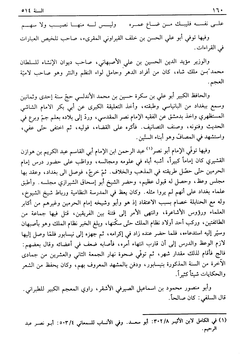 وفيها توفي أبو علي الحسن بن خلف القيراوني المقرىء، صاحب تلخيص العبارات في القراءات. والوزير مؤيد الدين الحسين بن علي الأصبهاني، صاحب ديوان الإنشاء للسلطان محمد بن ملك شاه، كان من أفراد الدهر وحامل لواء النظم والنثر وهو صاحب لامية العجم. والحافظ الكبير أبو علي بن سكرة حسين بن محمد الأندلسي حج سنة إحدى وثمانين وسمع ببغداد من البانياسي وطبقته، وأخذ التعليقة الكبرى عن أبي بكر الإمام الشاشي المستظهري واخذ بدمشق عن الفقيه الإمام نصر المقدسي، ورد إلى بلاده بعلم جم وبرع في الحديث وفنونه، وصنف التصانيف. فأكره على القضاء، فوليه، ثم اختفى حتى عفي، واستشهد في المصاف وهو أبناء الستين. وفيها توفي الإمام أبو نصر عبد الرحمن ابن الإمام أبي القاسم عبد الكريم بن هوازن القشيري كان إماماً كبيراً، أشبه أباه في علومه ومجالسه، وواظب على حضور درس إمام الحرمين حتى حصل طريقته في المذهب والخلاف. ثم خرج، فوصل الى بغداد، وعقد بها مجلس وعظ، وحصل له قبول عظيم، وحضر الشيخ أبو إسحاق الشيرازي مجلسه. وأطبق علماء بغداد على أنهم لم يروا مثله. وكان يعظ في المدرسة النظامية ورباط شيخ الشيوخ، وله مع الحنابلة خصام بسبب الاعتقاد إذ هو وأبو وشيخه إمام الحرمين وغيرهم من أكابر العلماء ورؤوس الأشاعرة، وانتهى الأمر إلى فتنة بين الفريقين، قتل فيها جماعة من الطائفتين، وركب أحد أولاد نظام الملك حتى سكنها، وبلغ الخبر نظام الملك وهو بأصبهان وسير إليه استدعاءه، فلما حضر عنده زاد في إكرامه، ثم جهزه إلى نيسابور فلما وصل إليها لازم الوعظ والدرس إلى أن قارب انتهاء أمره، فأصابه ضعف في أعضائه وقال بعضهم: فالج فأقام لذلك مقدار شهر، ثم توفي ضحوة نهار الجمعة الثاني والعشرين من جمادى الآخرة من السنة المذكورة بنيسابور، ودفن بالمشهد المعروف بهم، وكان يحفظ من الشعر والحكايات شيئاً كثيراً. وأبو منصور محمود بن اسماعيل الصيرفي الأشقر، راوي المعجم الكبير للطبراني. قال السلفي: كان صالحاً.