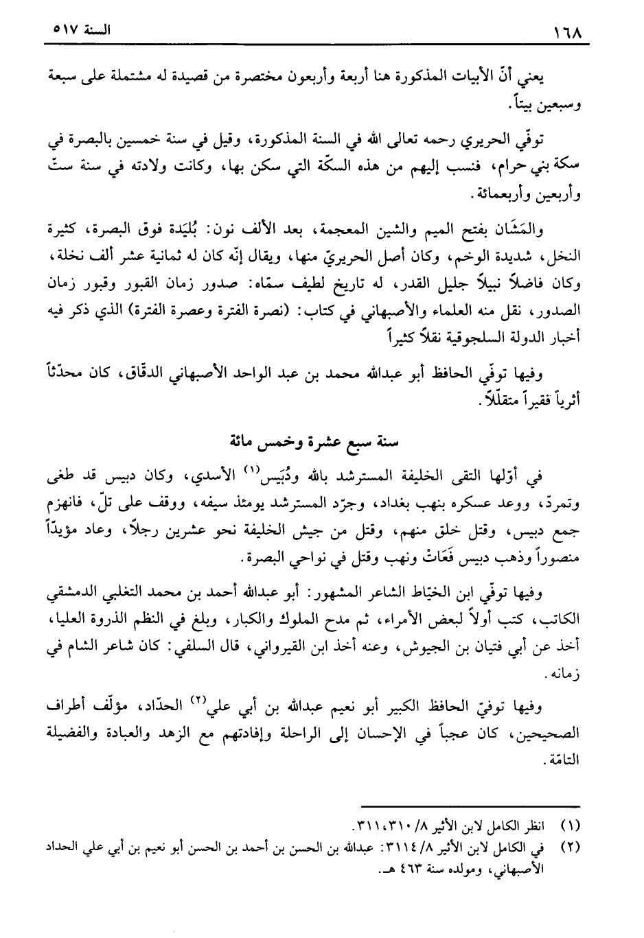 في أولها التقى الخليفة المسترشد بالله ودبيس الأسدي، وكان دبيس قد طغى وتمرد، ووعد عسكره بنهب بغداد، وجرد المسترشد يومئذ سيفه، ووقف على تل، فانهزم جمع دبيس، وقتل خلق منهم، وقتل من جيش الخليفة نحو عشرين رجلاً، وعاد مؤيداً منصوراً وذهب دبيس فعات ونهب وقتل في نواحي البصرة. وفيها توفي ابن الخياط الشاعر المشهور: أبو عبد الله أحمد بن محمد التغلبي الدمشقي الكاتب، كتب أولاً لبعض الأمراء، ثم مدح الملوك والكبار، وبلغ في النظم الذروة العليا، أخذ عن أبي فتيان بن الجيوش، وعنه أخذ ابن القيرواني، قال السلفي: كان شاعر الشام في زمانه. وفيها توفي الحافظ الكبير أبو نعيم عبد الله بن أبي علي الحداد، مؤلف أطراف الصحيحين، كان عجباً في الإحسان إلى الراحلة وإفادتهم مع الزهد والعبادة والفضيلة التامة.