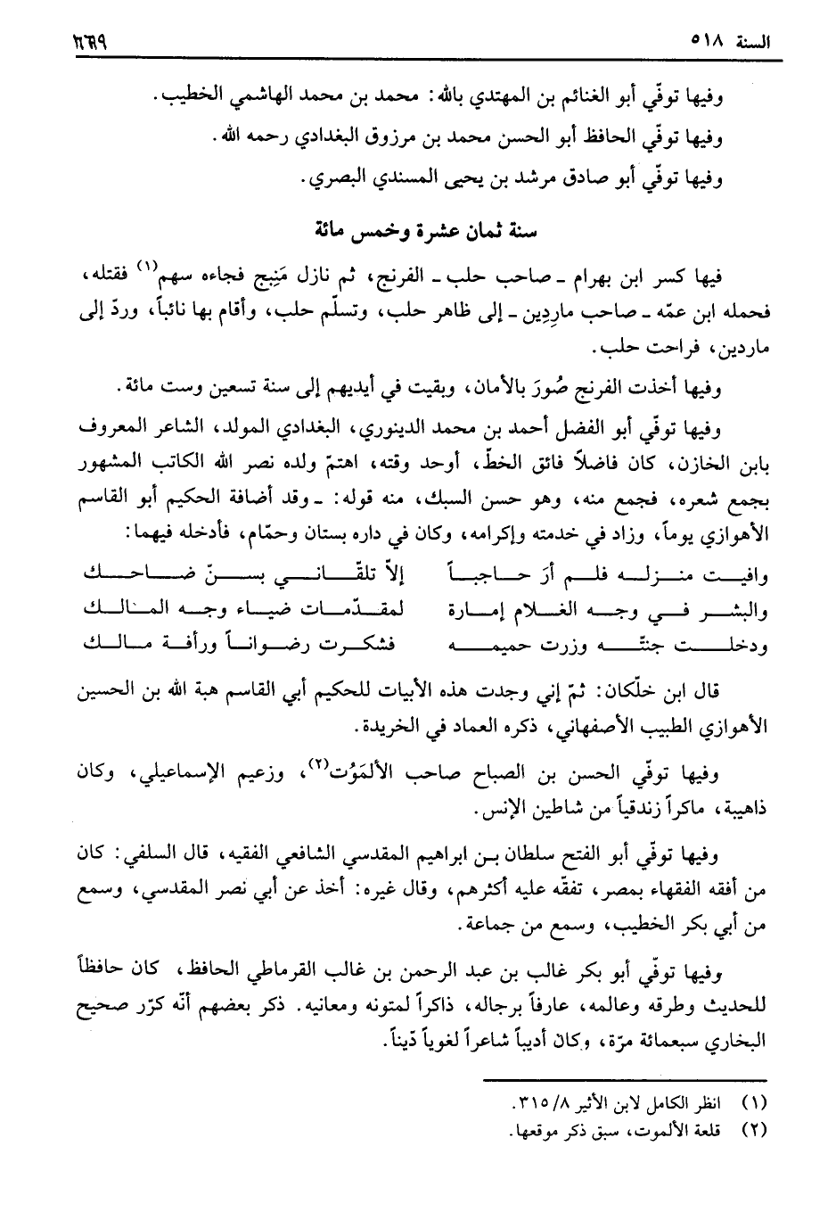 فيها كسر ابن بهرام - صاحب حلب - الفرنج، ثم نازل منبج فجاءه سهم فقتله، فحمله ابن عمه - صاحب ماردين - إلى ظاهر حلب، وتسلم حلب، وأقام بها نائباً، ورد إلى ماردين، فراحت حلب. وفيها أخذت الفرنج صور بالأمان، وبقيت في أيديهم إلى سنة تسعين وست مائة. وفيها توفي أبو الفضل أحمد بن محمد الدينوري، البغدادي المولد، الشاعر المعروف بابن الخازن، كان فاضلاً فائق الخط، أوحد وقته، اهتم ولده نصر الله الكاتب المشهور بجمع شعره، فجمع منه، وهو حسن السبك، منه قوله: - وقد أضافة الحكيم أبو القاسم الأهوازي يوماً، وزاد في خدمته وإكرامه، وكان في داره بستان وحمام، فأدخله فيهما:
