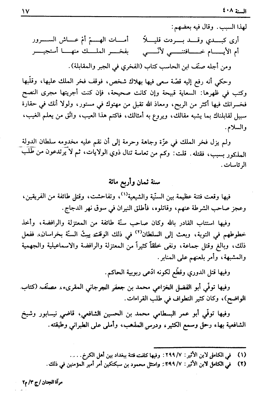 فيها وقعت فتنة عظيمة بين السنية والشيعي، وتفاحشت، وقتل طائفة من الفريقين، وعجز صاحب الشرطة عنهم، وقاتلوه، فأطلق الذيران في سوق نهر الدجاج. وفيها استتاب القادر بالله وكان صاحب سنة طائفة من المعتزلة والرافضة، وأخذ خطوطهم في التوبة، وبعث إلى السلطان في ذلك الوقت يبث السنة بخراسان، ففعل ذلك، وبالغ وقتل جماعة، ونفى خلقاً كثيراً من المعتزلة والرافضة والاسماعيلية والجهمية والمشبهة، وأمر بلعنهم على المنأبو. وفيها قتل الدوري وقطع لكونه ادعى ربوبية الحاكم. وفيها توفي أبو الفضل الخزاعي محمد بن جعفر الجرجاني المقرىء، مصنف كتاب الواضح، وكان كثير التطواف في طلب القراءات. وفيها توفي أبو عمر البسطامي محمد بن الحسين الشافعي، قاضي نيسابور وشيخ الشافعية بها، رحل وسمع الكثير، ودرس المذهب، وأملى على الطبراني وطبقته.