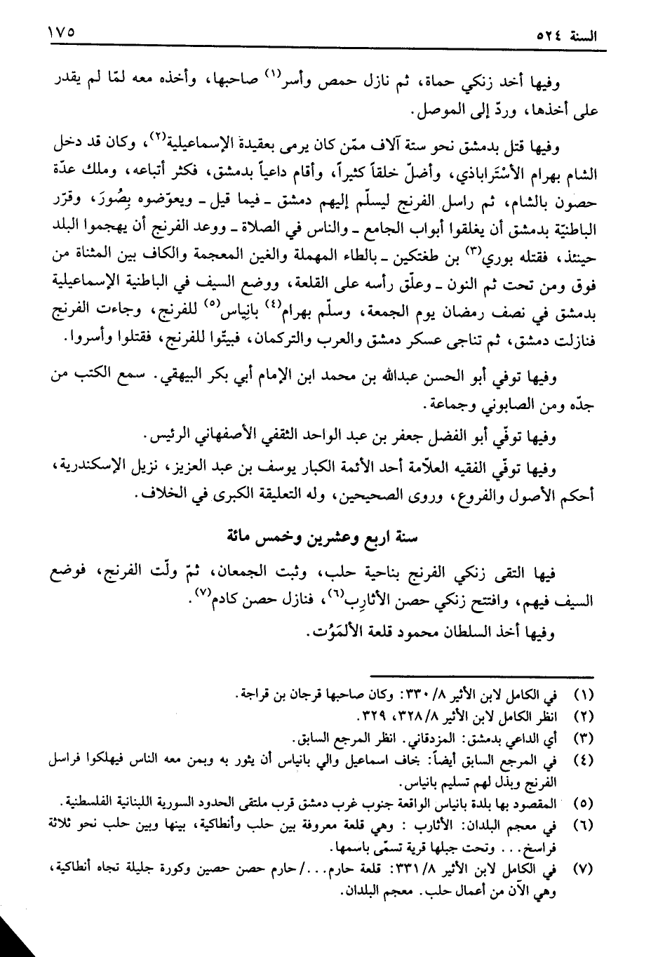 وفيها أخد زنكي حماة، ثم نازل حمص وأسر صاحبها، وأخذه معه لما لم يقدرعلى أخذها، ورد إلى الموصل. وفيها قتل بدمشق نحو ستة آلاف ممن كان يرمى بعقيدة الإسماعيلي، وكان قد دخل الشام بهرام الأستراباذي، وأضل خلقاً كثيراً، وأقام داعياً بدمشق، فكثر أتباعه، وملك عدة حصون بالشام، ثم راسل الفرنج ليسلم إليهم دمشق - فيما قيل - ويعوضوه بصور، وقرر، الباطنية بدمشق أن يغلقوا أبواب الجامع - والناس في الصلاة - ووعد الفرنج أن يهجموا البلد حينئذ، فقتله بوري بن طغتكين - بالطاء المهملة والغين المعجمة والكاف بين المثناة من فوق ومن تحت ثم النون - وعلق رأسه على القلعة، ووضع السيف في الباطنية الإسماعيلية بدمشق في نصف رمضان يوم الجمعة، وسلم بهرام بانياس للفرنج، وجاءت الفرنج فنازلت دمشق، ثم تناجى عسكر دمشق والعرب والتركمان، فبيتوا للفرنج، فقتلوا وأسروا. وفيها توفي أبو الحسن عبد الله بن محمد ابن الإمام أبي بكر البيهقي. سمع الكتب من جده ومن الصابوني وجماعة. وفيها توفي أبو الفضل جعفر بن عبد الواحد الثقفي الأصفهاني الرئيس. وفيها توفي الفقيه العلامة أحد الأئمة الكبار يوسف بن عبد العزيز، نزيل الإسكندرية، أحكم الأصول والفروع، وروى الصحيحين، وله التعليقة الكبرى في الخلاف.