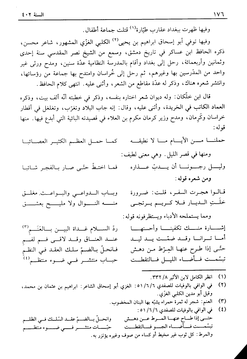 وفيها ظهرت ببغداد عقارب طيارة قتلت جماعة أطفال. وفيها توفي أبو إسحاق ابراهيم بن يحيى الكلبي الغزي المشهور، شاعر محسن، ذكره الحافظ ابن عساكر في تاريخ دمشق، وسمع من الشيخ نصر المقدسي سنة إحدى وثمانين وأربعمائة، رحل إلى بغداد وأقام بالمدرسة النظامية عدة سنين، ومدح ورثى غيرواحد من المدرسين بها وغيرهم، ثم رحل إلى خراسان وامتدح بها جماعة من رؤسائها، وانتشر شعره هناك، وذكر له عدة مقاطع من الشعر، وأثنى عليه. انتهى كلام الحافظ. قال ابن خلكان: وله ديوان شعر اختاره بنفسه، وذكر في خطبته أنه ألف بيت، وذكره العماد الكاتب في الخريدة، وأثنى عليه، وقال: إنه جاب البلاد وتغرب، وتغلغل في أقطار خراسان وكرمان، ومدح وزير كرمان مكرم بن العلاء في قصيدته البائية التي أبدع فيها. منها قوله: