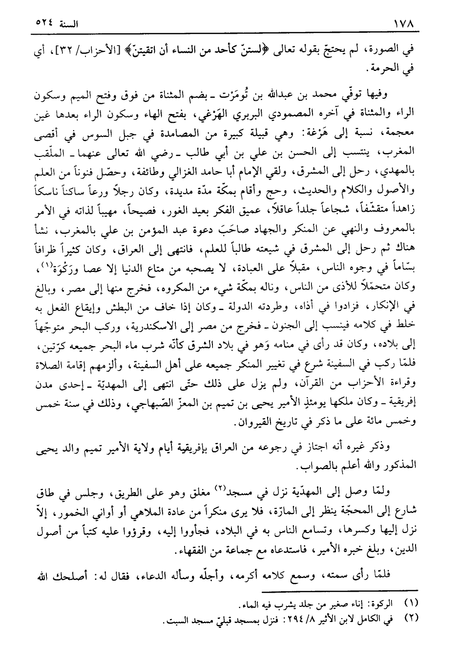 في الصورة، لم يحتج بقوله تعالى " لستن كأحد من النساء أن اتقيتن " - الأحزاب 32 -، أي في الحرمة. وفيها توفي محمد بن عبد الله بن تومرت - بضم المثناة من فوق وفتح الميم وسكون الراء والمثناة في آخره المصمودي البربري الهرغي، بفتح الهاء وسكون الراء بعدها غين معجمة، نسبة إلى هرغة: وهي قبيلة كبيرة من المصامدة في جبل السوس في أقصى المغرب، ينتسب إلى الحسن بن علي بن أبي طالب - رضي الله تعالى عنهما - الملقب بالمهدي، رحل إلى المشرق، ولقي الإمام أبا حامد الغزالي وطائفة، وحصل فنوناً من العلم والأصول والكلام والحديث، وحج وأقام بمكة مدة مديدة، وكان رجلاً ورعاً ساكناً ناسكاً زاهداً متقشفاً، شجاعاً جلداً عاقلاً، عميق الفكر بعيد الغور، فصيحاً، مهيباً لذاته في الأمر بالمعروف والنهي عن المنكر والجهاد صاحب دعوة عبد المؤمن بن علي بالمغرب، نشأ هناك ثم رحل إلى المشرق في شيعته طالباً للعلم، فانتهى إلى العراق، وكان كثيراً ظرافاً بساماً في وجوه الناس، مقبلاً على العبادة، لا يصحبه من متاع الدنيا إلا عصا وركو، وكان متحملاً للأذى من الناس، وناله بمكة شيء من المكروه، فخرج منها إلى مصر، وبالغ في الإنكار، فزادوا في أذاه، وطردته الدولة - وكان إذا خاف من البطش وإيقاع الفعل به خلط في كلامه فينسب إلى الجنون - فخرج من مصر إلى الاسكندرية، وركب البحر متوجهاً إلى بلاده، وكان قد رأى في منامه وهو في بلاد الشرق كأنه شرب ماء البحر جميعه كرتين، فلما ركب في السفينة شرع في تغيير المنكر جميعه على أهل السفينة، وألزمهم إقامة الصلاة وقراءة الأحزاب من القرآن، ولم يزل على ذلك حتى انتهى إلى المهدية - إحدى مدن إفريقية - وكان ملكها يومئذ الأمير يحيى بن تميم بن المعز الصبهاجي، وذلك في سنة خمس وخمس مائة على ما ذكر في تاريخ القيروان. وذكر غيره أنه اجتاز في رجوعه من العراق بإفريقية أيام ولاية الأمير تميم والد يحيى المذكور والله أعلم بالصواب. ولما وصل إلى المهدية نزل في مسجد مغلق وهو على الطريق، وجلس في طاق شارع إلى المحجة ينظر إلى المارة، فلا يرى منكراً من عادة الملاهي أو أواني الخمور، إلا نزل إليها وكسرها، وتسامع الناس به في البلاد، فجأووا إليه، وقرؤوا عليه كتباً من أصول الدين، وبلغ خبره الأمير، فاستدعاه مع جماعة من الفقهاء.