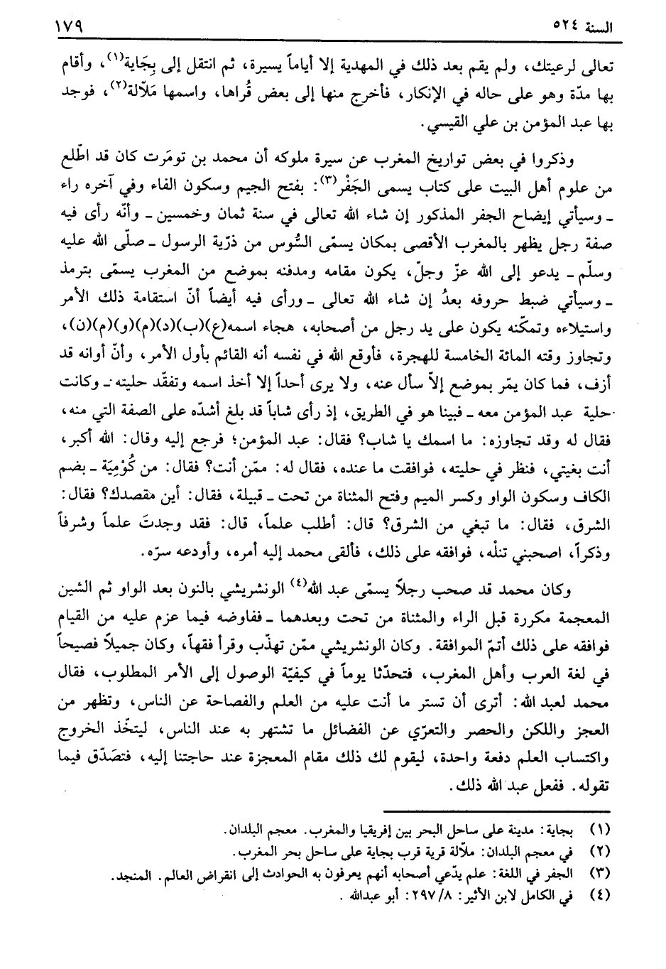 تعالى لرعيتك، ولم يقم بعد ذلك في المهدية إلا أياماً يسيرة، ثم انتقل إلى بجاي، وأقام بها مدة وهو على حاله في الإنكار، فأخرج منها إلى بعض قراها، واسمها ملال، فوجد بها عبد المؤمن بن علي القيسي. وذكروا في بعض تواريخ المغرب عن سيرة ملوكه أن محمد بن تومرت كان قد اطلع من علوم أهل البيت على كتاب يسمى الجف: بفتح الجيم وسكون الفاء وفي آخره راء - وسيأتي إيضاح الجفر المذكور إن شاء الله تعالى في سنة ثمان وخمسين - وانه رأى فيه صفة رجل يظهر بالمغرب الأقصى بمكان يسمى السوس من ذرية الرسول - صلى الله عليه وسلم - يدعو إلى الله عز وجل، يكون مقامه ومدفنه بموضع من المغرب يسمى بترمذ - وسيأتي ضبط حروفه بعد إن شاء الله تعالى - ورأى فيه أيضاً أن استقامة ذلك الأمر واستيلاءه وتمكنه يكون على يد رجل من أصحابه، هجاء اسمه ع ب د م وم ن، وتجاوز وقته المائة الخامسة للهجرة، فأوقع الله في نفسه أنه القائم بأول الأمر، وأن أوانه قد أزف، فما كان يمر بموضع إلا سأل عنه، ولا يرى أحداً إلا أخذ اسمه وتفقد حليته - وكانت حلية عبد المؤمن معه - فبينا هو في الطريق، إذ رأى شاباً قد بلغ أشده على الصفة التي منه، فقال له وقد تجاوزه: ما اسمك يا شاب؟ فقال: عبد المؤمن، فرجع إليه وقال: الله أكبر، أنت بغيتي، فنظر في حليته، فوافقت ما عنده، فقال له: ممن أنت؟ فقال: من كومية - بضم الكاف وسكون الواو وكسر الميم وفتح المثناة من تحت - قبيلة، فقال: أين مقصدك؟ فقال: الشرق، فقال: ما تبغي من الشرق؟ قال: أطلب علماً، قال: فقد وجدت علماً وشرفاً وذكراً، اصحبني تنله، فوافقه على ذلك، فألقى محمد إليه أمره، وأودعه سره. وكان محمد قد صحب رجلاً يسمى عبد الله الونشريشي بالنون بعد الواو ثم الشين المعجمة مكررة قبل الراء والمثناة من تحت وبعدهما - ففاوضه فيما عزم عليه من القيام فوافقه على ذلك أتم الموافقة. وكان الونشريشي ممن تهذب وقرأ فقهاً، وكان جميلاً فصيحاً في لغة العرب وأهل المغوب، فتحدثاً يوماً في كيفية الوصول إلى الأمر المطلوب، فقال محمد لعبد الله: أترى أن تستر ما أنت عليه من العلم والفصاحة عن الناس، وتظهر من العجز واللكن والحصر والتعري عن الفضائل ما تشتهر به عند الناس، ليتخذ الخروج واكتساب العلم دفعة واحدة، ليقوم لك ذلك مقام المعجزة عند حاجتنا إليه، فتصدق فيما تقوله. ففعل عبد الله ذلك.