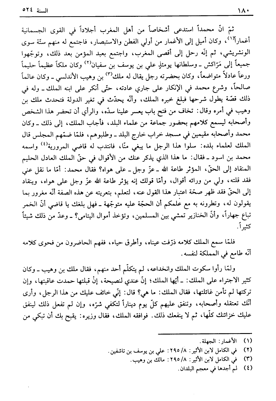 ثم ان محمداً استدعى أشخاصاً من أهل المغرب أجلاداً في القوى الجسمانية أغماراً، وكان أميل إلى الأغمار من أولي الفطن والاستبصار، فاجتمع له منهم ستة سوى الونشريشي، ثم إنه رحل إلى أقصى المغرب، واجتمع بعبد المؤمن بعد ذلك، وتوجهوا جميعاً إلى مراكش - وسلطانها يومئذ علي بن يوسف بن سفيان وكان ملكاً عظيماً حليماً ورعاً عادلاً متواضعاً، وكان بحضرته رجل يقال له ملك بن وهيب الأندلسي - وكان عالماً صالحاً، وشرع محمد في الإنكار على جاري عادته، حتى أنكر على ابنه الملك - وله في ذلك قصة يطول شرحها فبلغ خبره الملك، وأنه يحدث في تغير الدولة فتحدث ملك بن وهيب في أمره وقال: تخاف من فتح باب يعسر علينا سده، والرأي أن تحضر هذا الشخص وأصحابه ليسمع كلامهم بحضور جماعة من علماء البلد، أجاب الملك، إلى ذلك - وكان محمد وأصحابه مقيمين في مسجد خراب خارج البلد - وطلبوهم، فلما ضمهم المجلس قال الملك لعلماء بلده: سلوا هذا الرجل ما يبغي منا، فانتدب له قاضي المرورية واسمه محمد بن اسود - فقال: ما هذا الذي يذكر عنك من الأقوال في حق الملك العادل الحليم المنقاد إلى الحق، المؤثر طاعة الله - عز وجل - على هواه؟ فقال محمد: أما ما نقل عني فقد قلته، ولي من ورائه أقوال، وأما قولك إنه يؤثر طاعة الله عز وجل على هواه، وينقاد إلى الحق فقد ظهر صحة اعتبار هذا القول عنه، لتعلم، بتعريته عن هذه الصفة أنه مغرور بما يقولون له، وتطرونه به مع علمكم أن الحجة عليه متوجهة - فهل بلغك يا قاضي أن الخمر تباع جهاراً، وأن الخنازير تمشي بين المسلمين، وتؤخذ أموال اليتامى؟ - وعد من ذلك شيئاً كثيراً. فلما سمع الملك كلامه ذزفت عيناه، وأطرق حياء، ففهم الحاضرون من فحوى كلامه أنه طامع في المملكة لنفسه. ولما رأوا سكوت الملك وانخداعه، لم يتكلم أحد منهم، فقال ملك بن وهيب - وكان