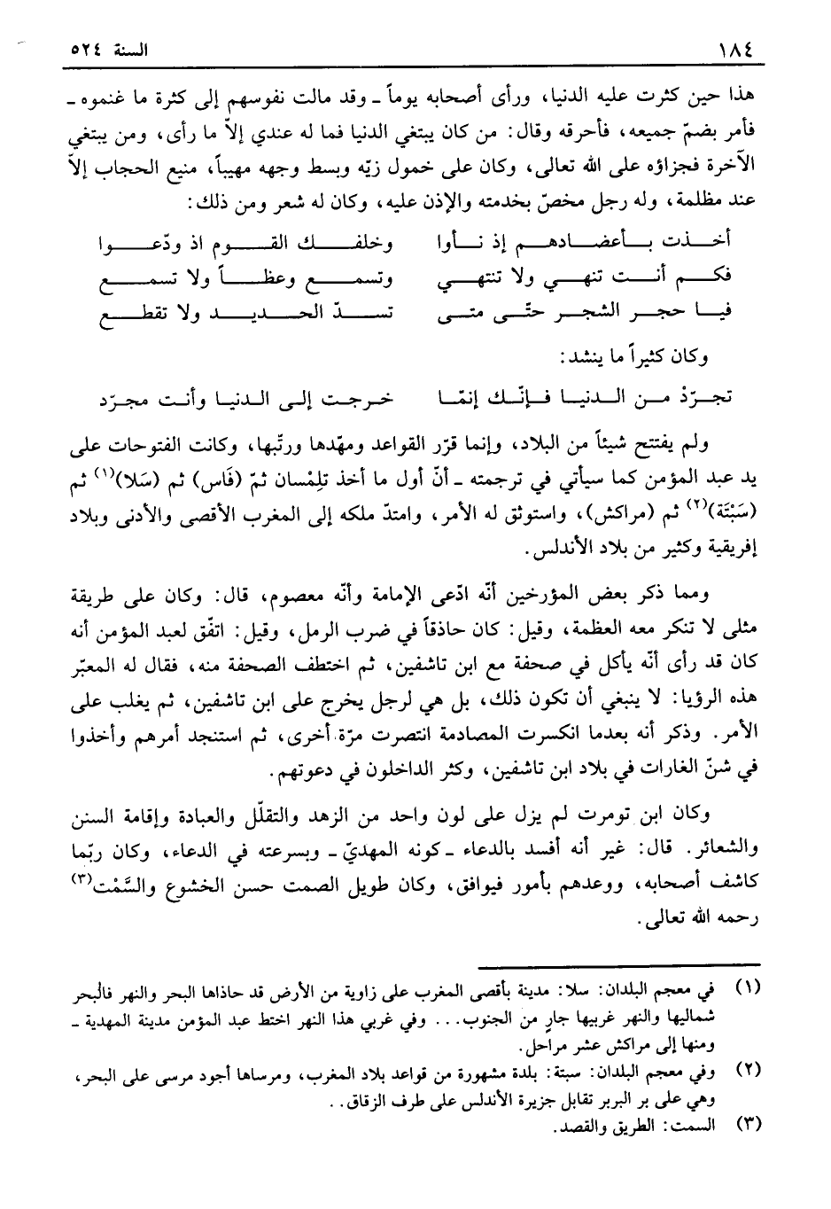 ولم يفتتح شيئاً من البلاد، وإنما قرر القواعد ومهدها ورتبها، وكانت الفتوحات على يد عبد المؤمن كما سيأتي في ترجمته - أن أول ما أخذ تلمسان ثم فاس ثم سلا ثم سبتة ثم مراكش، واستوثق له الأمر، وامتد ملكه إلى المغرب الأقصى والأدنى وبلاد إفريقية وكثير من بلاد الأندلس. ومما ذكر بعض المؤرخين أنه ادعى الإمامة وأنه معصوم، قال: وكان على طريقة مثلى لا تنكر معه العظمة، وقيل: كان حاذقاً في ضرب إلىمل، وقيل: اتفق لعبد المؤمن أنه كان قد رأى أنه جمل في صحفة مع ابن تاشفين، ثم اختطف الصحفة منه، فقال له المعبر هذه إلىؤيا: لا ينبغي أن تكون ذلك، بل هي لرجل يخرج على ابن تاشفين، ثم يغلب على الأمر. وذكر أنه بعدما انكسرت المصادمة انتصرت مرة أخرى، ثم استنجد أمرهم وأخذوا في شن ألفارات في بلاد ابن تاشفين، وكثر ألفاخلون في دعوتهم. وكان ابن تومرت لم يزل على لون واحد من الزهد والتقلل والعبادة وإقامة السنن والشعائر. قال: غير أنه أفسد بالدعاء - كونه المهدي - وبسرعته في الدعاء، وكان ربما كاشف أصحابه، ووعدهم بأمور فيوافق، وكان طويل الصمت حسن الخشوع والسمت رحمه الله تعالى.