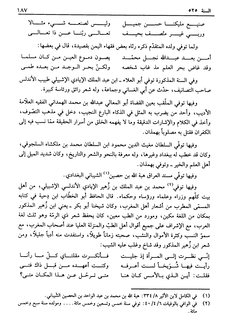 وفي السنة المذكورة توفي أبو العلاء - ابن عبد الملك الإيادي الإشبيلي طبيب الأندلس صاحب التصانيف، حدث عن أبي الغساني وجماعة، وله شعر رائق ورئاسة كبيرة. وفيها توفي الملقب بعين القضاة أبو المعالي عبد الله بن محمد آلهمداني الفقيه العلامة الأديب، وأحد من يضرب به المثل في الذكاء ألفارع النجيب، دخل فى مذهب التصوف، وأخذ في الكلام والإشارات الدقيقة وما لا يفهمه الخلق من أسرار الحقيقة مما نسب فيه إلى الكفيان فقتل به مصلوباً بهمذان. وفيها توفي السلطان مغيث الدين محمود ابن السلطان محمد بن ملكشاه السلجوقي، وكان قد خطب له ببغداد وغيرها، وله معرفة بالنحو والشعر والتاريخ، وكان شديد الميل إلى أهل العلم والخير - وتوفي بهمذان. وفيها توفي مسند العراق هبة الله بن حصين الشيباني البغدادي. وفيها توفي محمد بن عبد الملك بن زهير الإيادي الأندلسي الإشبيلي، من أهل بيت كلهم وزراء وعلماء ورؤساء وحكماء. قال الحافظ أبو الخطاب ابن دحية في كتابه المسمى المطرب من أشعار أهل المغرب، وكان شيخنا أبو بكر - يعني ابن زهير المذكور بمكان من اللغة مكين، ومورد من الطب معين، كان يحفظ شعر ذي إلىمة وهو ثلث لغة العرب، مع الإشراف على جميع أقوال أهل الطب والمنزلة العلما عند أصحاب المغرب، مع سمو النسب وكثرة الأموال والنشب، صحبته زماناً طويلاً، واستفدت منه أدباً جليلاً، ومن شعر ابن زهير المذكور وقد شاخ وغلب عليه الشيب: