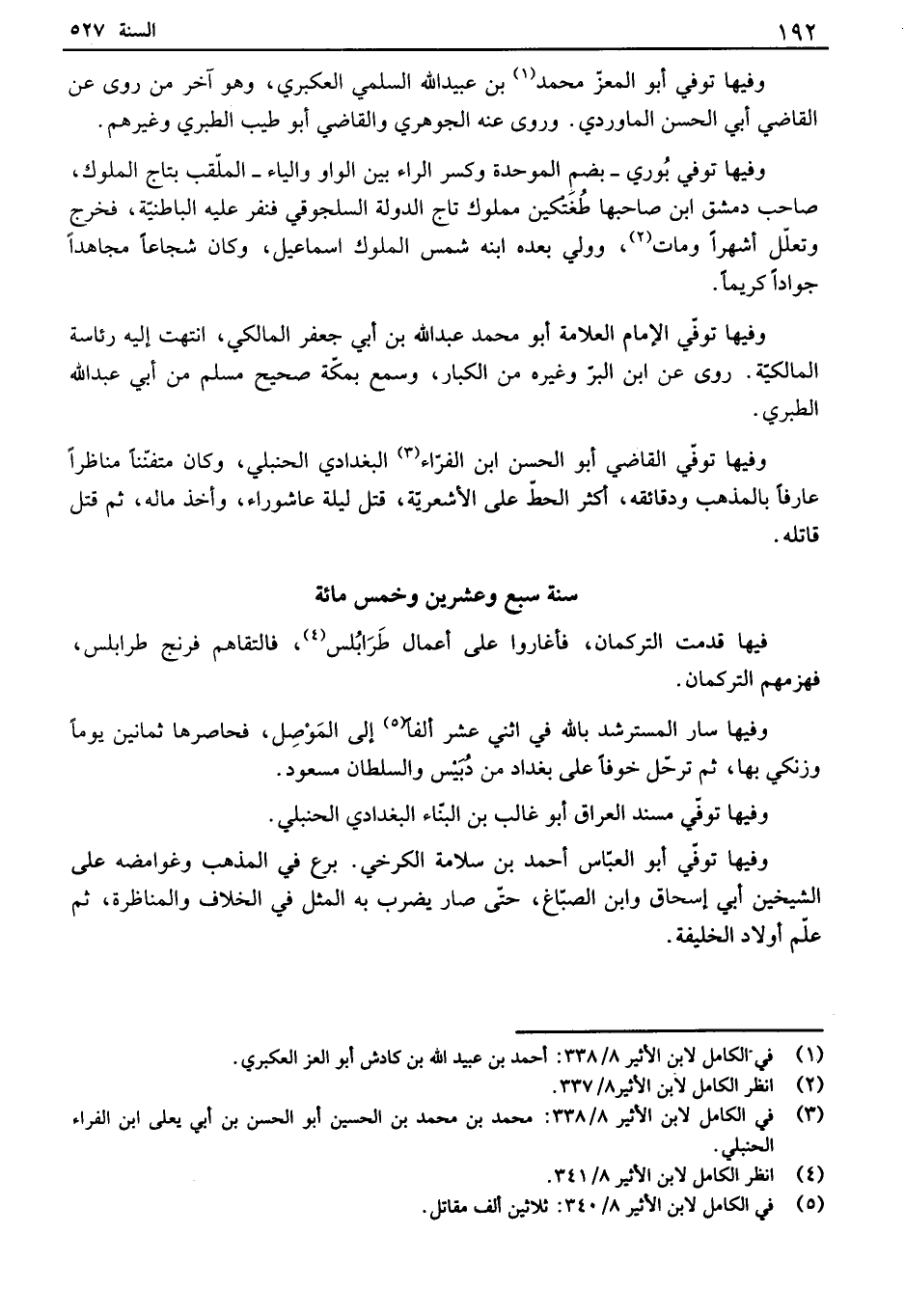وفيها توفي أبو المعز محمد بن عبد الله السلمي العكبري، وهو آخر من روى عن القاضي أبي الحسن ألفاوردي. وروى عنه الجوهري والقاضي أبو طيب الطبري وغيرهم. وفيها توفي بوري - بضم الموحدة وكسر إلىاء بين الواو والماء - الملقب بتاج الملوك، صاحب دمشق ابن صاحبها طغتكين مملوك تاج الدولة السلجوقي فنفي عليه ألفاطنية، فخرج وتعلل أشهراً ومات، وولي بعده ابنه شمس الملوك اسماعيل، وكان شجاعاً مجاهداً جواداً كريماً. وفيها توفي الإمام العلامة أبو محمد عبد الله بن أبي جعفر ألفالكي، انتهت إليه رئاسة ألفالكية. روى عن ابن البر وغيره من الكبار، وسمع بمكة صحيح مسلم من أبي عبد الله الطبري. وفيها توفي القاضي أبو الحسن ابن الفياء البغدادي الحنبلي، وكان متفنناً مناظراً عارفاً بالمذهب ودقائقه، أكثر الحط على الأشعرية، قتل ليلة عاشوراء، وأخذ مآله، ثم قتل قاتله.