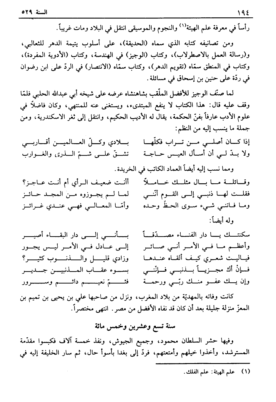 رأساً في معرفة علم آلهيئة والنجوم والموسيقى انتقل في البلاد ومات غريباً. ومن تصانيفه كتابه الذي سماه الحديقة، على أسلوب يتيمة الدهر للثعالبي، ورسالة العمل بالاصطرلاب، وكتاب الوجيز في آلهندسة، وكتاب الأدوية المفيدة، وكتاب في المنطق سماه تقويم الدهر، وكتاب سماه الانتصار في إلىد على ابن رضوان في ردة على حنين بن إسحاق في مسائلة. لما صنف الوجيز للأفضل الملقب بشاهنشاه عرضه على شيخه أبي عبد الله الحلبي فلما وقف عليه قال: هذا الكتاب لا ينفع المبتدىء، ويستغنى عنه للمنتهي، وكان فاضلاً في علوم الأدب عارفاً بفن الحكمة، يقال له الأديب الحكيم، وانتقل إلى ثغر الاسكندرية، ومن جملة ما ينسب إليه من النظم:
