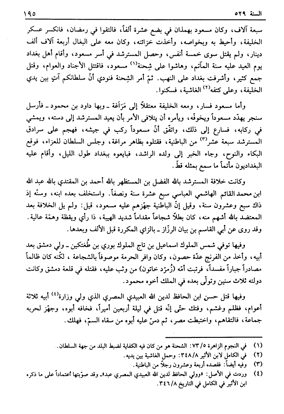 وأما مسعود فسار، ومعه الخليفة معتقلاً إلى مراغة - وبها داود بن محمود - فأرسل سنجر يهدد مسعوداً ويخوفه، ويأمره أن يتلافى الأمر بأن يعيد المسترشد إلى دسته، ويمشي في ركابه، فسارع إلى ذلك، واتفق أن مسعوداً ركب في جيشه، فهجم على سرادق المسترشد سبعة عشر من ألفاطنية، فقتلوه بظاهر مراغة، وجلس السلطان للعزاء، فوقع البكاء والنوح، وجاء الخبر إلى ولده إلىاشد، فبايعوه ببغداد طول الليل، وأقام عليه البغداديون مأتماً ما سمع بمثله قط. وكانت خلافة المسترشد بالله الفضل بن المستظهر بالله أحمد بن المقتدي بالله عبد الله ابن محمد ألفائم آلهاشمي العباسي سبع عشرة سنة ونصفاً. واستخلف بعده ابنه، وسنه إذ ذاك سبع وعشرون سنة، وقيل إن ألفاطنية جهزهم عليه مسعود، قيل: ولم يل الخلافة بعد المعتضد بالله أشهم منه، كان بطلاً شجاعاً مقداماً شديد آلهيبة، ذا رأي ويقظة وهمة عالية. وقد روى عن أبي القاسم بن بيان إلىزاز - بالزاي المكررة قبل الألف وبعدها. وفيها توفي شمس الملوك اسماعيل بن تاج الملوك بوري بن طغتكين - ولي دمشق بعد أبيه، وأخذ من الفرنج عدة حصون، وكان وافي الحرمة موصوفاً بالشجاعة، لكنه كان ظألفا مصادراً جباراً مفسداً، فيتبت أمه زمند خاتون من وثب عليه، فقتله في قلعة دمشق وكانت دولته ثلاث سنين وتولى بعده في الملك أخوه محمود. وفيها قتل حسن ابن الحافظ لدين الله العبيدي المصري الذي ولي وزارة أبيه ثلاثة أعوام، فظلم وغشم، وفتك حتى إنه قتل في ليلة أربعين أميراً، فخافه أبوه، وجهز لحربه جماعة، فالتقاهم، واختبطت مصر، ثم دس عليه أبوه من سقاه السم، فهلك.