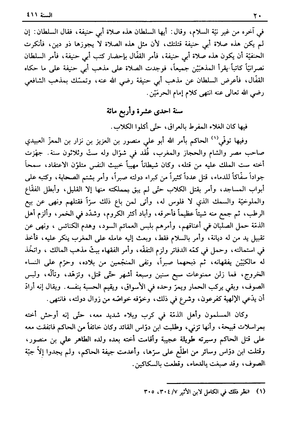 فيها كان الغلاء المفرط بالعراق، حتى أكلوا الكلاب. وفيها توفي الحاكم بأمر الله أبو علي منصور بن العزيز بن نزار بن المعز العبيدي صاحب مصر والشام والحجاز والمغرب، فقد في شوال وله ست وثلاثون سنة. جهزت أخته ست الملك عليه من قتله، وكان شيطاناً مهيباً خبيث النفس متلون الاعتقاد، سمحاً جواداً سفاكاً للدماء، قتل عدداً كثيرأ من كبراء دولته صبراً، وأمر بشتم الصحابة، وكتبه على أبواب المساجد، وأمر بقتل الكلاب حتى لم يبق بمملكته منها إلا القليل، وأبطل الفقاع والملوخية والسمك الذي لا فلوس له، وأتى لمن باع ذلك سراً فقتلهم ونهى عن بيع الرطب، ثم جمع منه شيئاً عظيماً فأحرقه، وأباد أكثر الكروم، وشدد في الخمر، وألزم أهل الذمة حمل الصلبان في أعناقهم، وأمرهم بلبس العمائم السود، وهدم الكنائس، ونهى عن تقبيل يد من له ديانة، وأمر بالسلام فقط، وبعث إليه عامله على المغرب ينكر عليه، فأخذ في استمالته، وحمل في كمه الدفاتر ولزم التفقه، وأمر الفقهاء ببث مذهب المالك، واتخذ له مالكيين يفقهانه، ثم ذبحهما صبراً، ونفى المنجمين من بلاده، وحرم على النساء الخروج، فما زلن ممنوعات سبع سنين وسبعة أشهر حتى قتل، وتزهد، وتأله، ولبس الصوف، وبقي يركب الحمار ويمر وحده في الأسواق، ويقيم الحسبة بنفسه. ويقال إنه أراد أن يدعي الإلهية كفرعون، وشرع في ذلك، وخوفه خواصه عن زوال دولته، فانتهى. وكان المسلمون وأهل الذمة في كرب وبلاء شديد معه، حتى إنه أوحش أخته بمراسلات قبيحة، وأتها تزني، وطلبت ابن دواس القائد وكان خائفاً من الحاكم فاتفقت معه على قتل الحاكم وسيرته طويلة عجيبة وأقامت أخته بعده ولده الطاهر علي بن منصور، وقتلت ابن دواس وسائر من اطلع على سرها، وأعدمت جيفة الحاكم، ولم يجدوا إلا جبة الصوف، وقد صبغت بالدماء، وقطعت بالسكاكين.