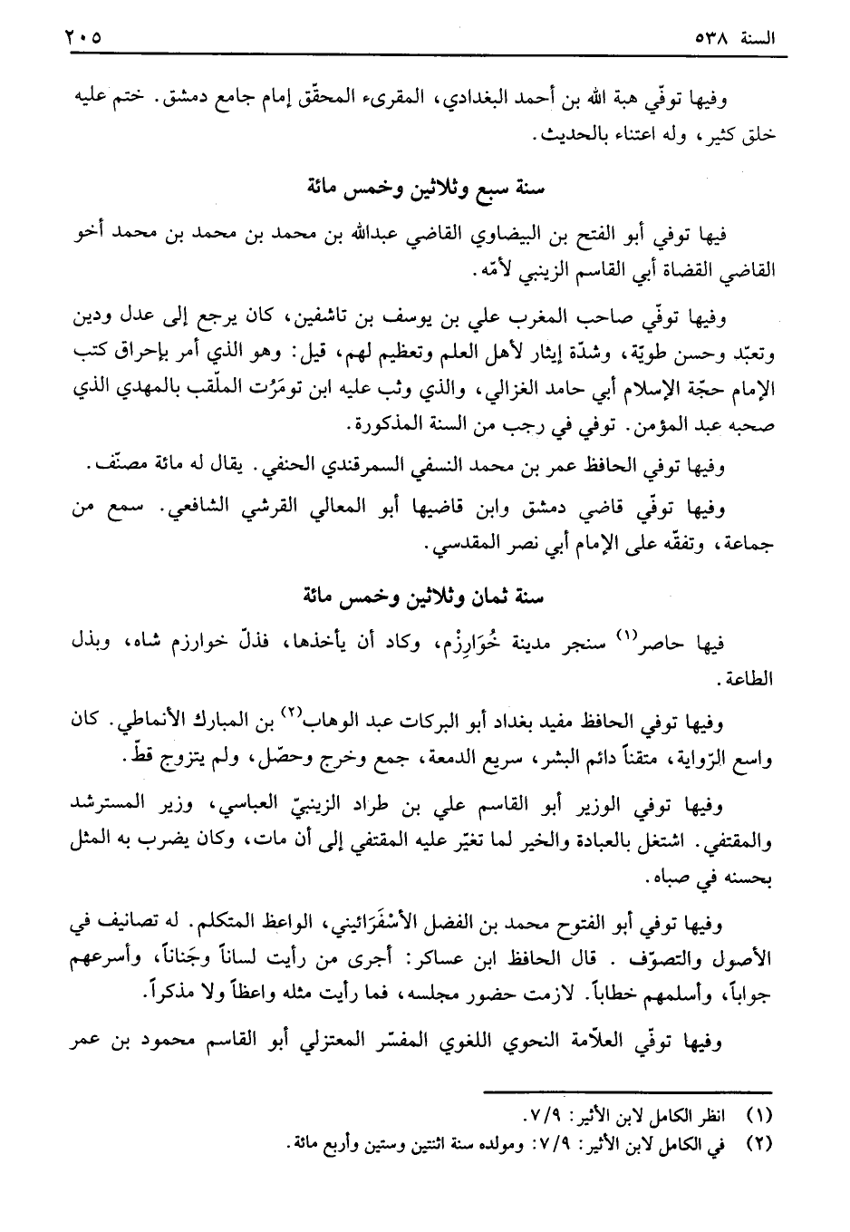فيها حاصر سنجر مدينة خوارزم، وكاد أن يأخذها، فذل خوارزم شاه، وبذل الساعة. وفيها توفي الحافظ مفيد بغداد أبو البركات عبد الوهاب بن المبارك الأنماطي. كان واسع إلىواية، متقناً دائم البشر، سريع الدمعة، جمع وخرج وحصل، ولم يتزوج قط. وفيها توفي الوزير أبو القاسم علي بن طراد الزينبي العباسي، وزير المسترشد والمقتفي. اشتغل بالعبادة والخير لما تغير عليه المقتفي إلى أن مات، وكان يضرب به المثل بحسنه في صباه. وفيها توفي أبو الفتوح محمد بن الفضل الأسفيائيني، الواعظ المتكلم. له تصانيف في الأصول والتصوف. قال الحافظ ابن عساكر: أجرى من رأيت لماناً وجناناً، وأسرعهم جواباً، وأسلمهم خطاباً. لازمت حضور مجلسه، فما رأيت مثله واعظاً ولا مذكراً. وفيها توفي العلامة النحوي اللغوي المفسر المعتزلي أبو القاسم محمود بن عمر