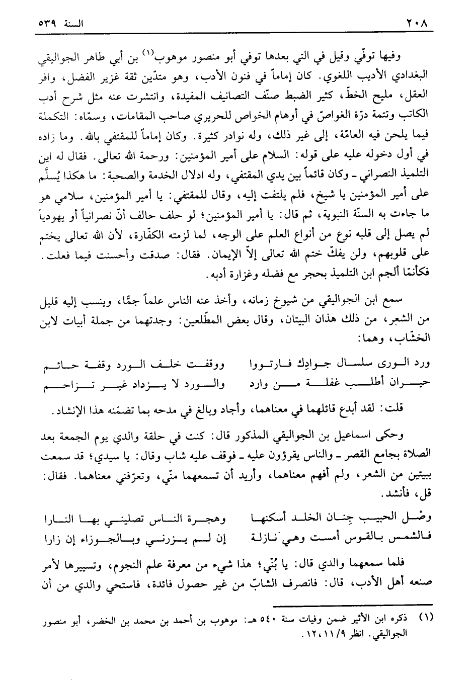 وفيها توفي وقيل في التي بعدها توفي أبو منصور موهوب بن أبي طاهر الجواليقي البغدادي الأديب اللغوي. كان إماماً في فنون الأدب، وهو متدين ثقة غزير الفضل، وافي العقل، مليح الخط، كثير الضبط صنف التصانيف المفيدة، وانتشرت عنه مثل شرح أدب ألفاتب وثمة درة الغواص في أوهام الخواص للحريري صاحب المقامات، وسماه: التكملة فيما يلحن فيه الشامة، إلى غير ذلك، وله نوادر كثيرة. وكان إماماً للمقتفي بالله. وما زاده في أول دخوله عليه على قوله: السلام على أمير المؤمنين: ورحمة الله تعالى. فقال له اين التلميذ النصراني - وكان قائماً بين يدي المقتفي، وله ادلال الخدمة والصحبة: ما هكذا يسلم على أمير المؤمنين يا شيخ، فلم يلتفت إليه، وقال للمقتفي: يا أمير المؤمنين، سلامي هو ما جاءت به السنة النبوية، ثم قال: يا أمير المؤمنين؛ لو حلف حالف أن نصرانياً أو يهودياً لم يصل إلى قلبه نوع من أنواع العلم على الوجه، لما لزمته الكفارة، لأن الله تعالى يختم على قلوبهم، ولن يفك ختم الله تعالى إلا الإيمان. فقال: صدقت وأحسنت فيما فعلت. فكأنما ألجم ابن التلميذ بحجر مع فضله وغزارة أدبه. سمع ابن الجواليقي من شيوخ زمانه، وأخذ عنه الناس علماً جما، وينسب إليه قليل من الشعر، من ذلك هذان البيتان، وقال بعض المطلعين: وجدتهما من جملة أبيات لابن الخشاب، وهما: