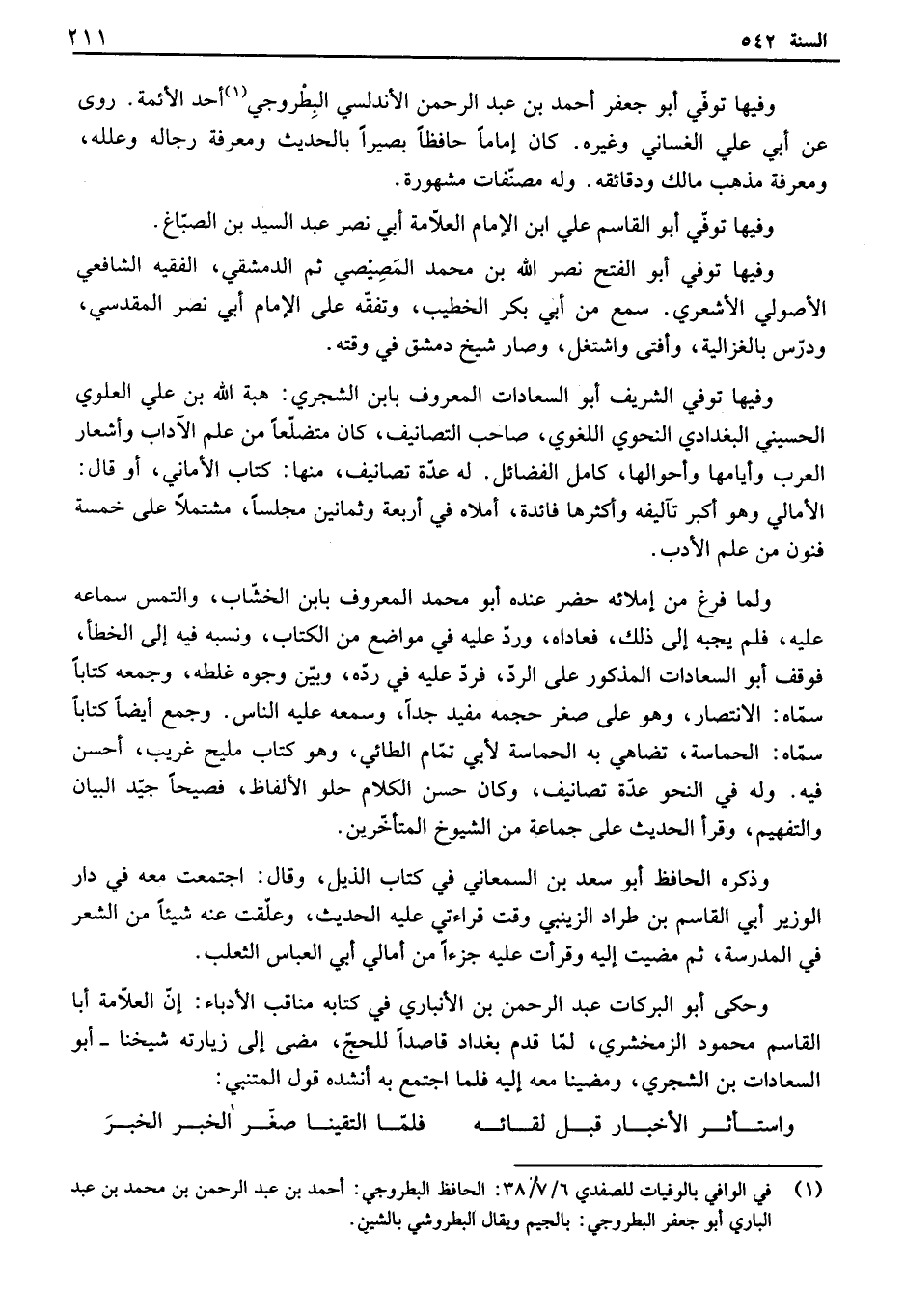 وفيها توفي أبو جعفر أحمد بن عبد إلىحمن الأندلسي البطروجي أحد الأئمة. روى عن أبي علي الغساني وغيره. كان إماماً حافظاً بصيراً بالحديث ومعرفة رجآله وعلله، ومعرفة مذهب مالك ودقائقه. وله مصنفات مشهورة. وفيها توفي أبو القاسم علي ابن الإمام العلامة أبي نصر عبد السيد بن الصباغ. وفيها توفي أبو الفتح نصر الله بن محمد المصيصي ثم الدمشقي، الفقيه الشافعي الأصولي الأشعري. سمع من أبي بكر الخطيب، وتفقه على الإمام أبي نصر المقدسي، ودرس بالغزالية، وأفتى واشتغل، وصار شيخ دمشق في وقته. وفيها توفي الشريف أبو السعادات المعروف بابن الشجري: هبة الله بن علي العلوي الحسيني البغدادي النحوي اللغوي، صاحب التصانيف، كان متضلما من علم الآداب وأشعار العرب وأيامها وأحوآلها، كامل الفضائل. له عدة تصانيف، منها: كتاب الأماني، أو قال: الأمالي وهو أكبر تآليفه وأكثرها فائدة، أملاه في أربعة وثمانين مجلما، مشتملاً على خمسة فنون من علم الأدب. ولما فيغ من إملأنه حضر عنده أبو محمد المعروف بابن الخشاب، والتمس سماعه عليه، فلم يجبه إلى ذلك، فعاداه، ورد عليه في مواضع من الكتاب، ونسبه فيه إلى الخطأ. فوقف أبو السعادات المذكور على إلىد، فيد عليه في رده، وبين وجوه غلطه، وجمعه كتاباً سماه: الانتصار، وهو على صغر حجمه مفيد جداً، وسمعه عليه الناس. وجمع أيضاً كتاباً سماه: الحماسة، تضاهي به الحماسة لأبي تمام ألفائي، وهو كتاب مليح غريب، أحسن فيه. وله في النحو عدة تصانيف، وكان حسن الكلام حلو الألفاظ، فصيحاً جيد البيان والتفهيم، وقرأ الحديث على جماعة من الشيوخ المتأخرين. وذكره الحافظ أبو سعد بن السمعاني في كتاب الذيل، وقال: اجتمعت معه في دار الوزير أبي القاسم بن طراد الزينبي وقت قراءتي عليه الحديث، وعلقت عنه شيئاً من الشعر في المدرسة، ثم مضيت إليه وقرأت عليه جزءاً من أمالي أبي العباس الثعلب. وحكى أبو البركات عبد إلىحمن بن الأنباري في كتابه مناقب الأدباء: إن العلامة أبا القاسم محمود الزمخشري، لما قدم بغداد قاصداً للحج، مضى إلى زيارته شيخنا - أبو السعادات بن الشجري، ومضينا معه إليه فلما اجتمع به أنشده قول المتنبي: