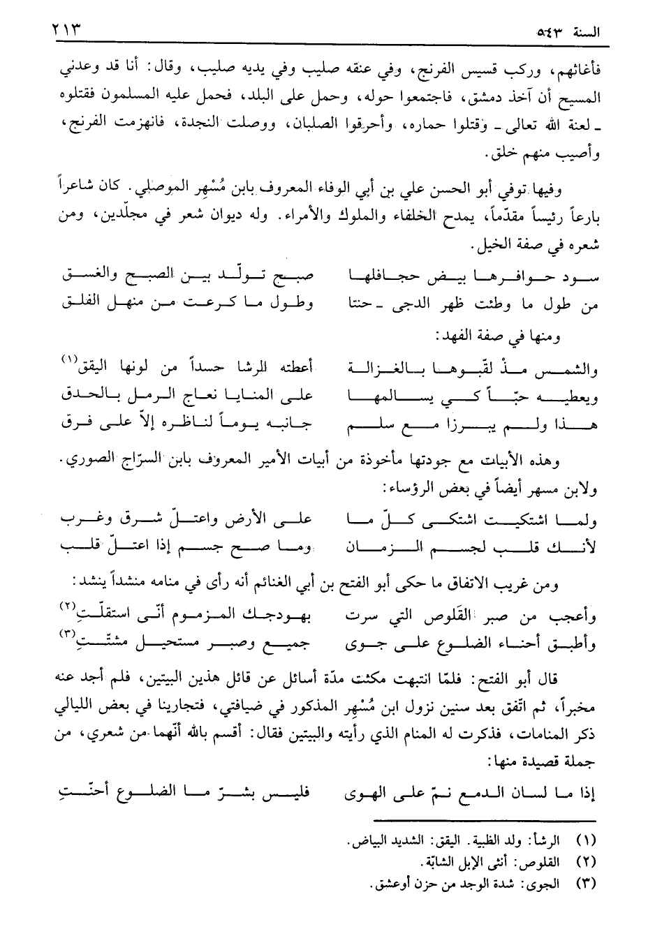 فأغاثهم، وركب قسيس الفرنج، وفي عنقه صليب وفي يديه صليب، وقال: أنا قد وعدني المسيح أن آخذ دمشق، فاجتمعوا حوله، وحمل على البلد، فحمل عليه المسلمون فقتلوه - لعنة الله تعالى - وقتلوا حماره، وأحرقوا الصلمان، ووصلت النجدة، فانهزمت الفرنج، وأصيب منهم خلق. وفيها توفي أبو الحسن علي بن أبي الوفاء المعروف بابن مسهر الموصلي. كان شاعراً بارعاً رئيساً مقدماً، يمدح الخلفاء والملوك والأمراء. وله ديوان شعر في مجلدين، ومن شعره في صفة الخيل.