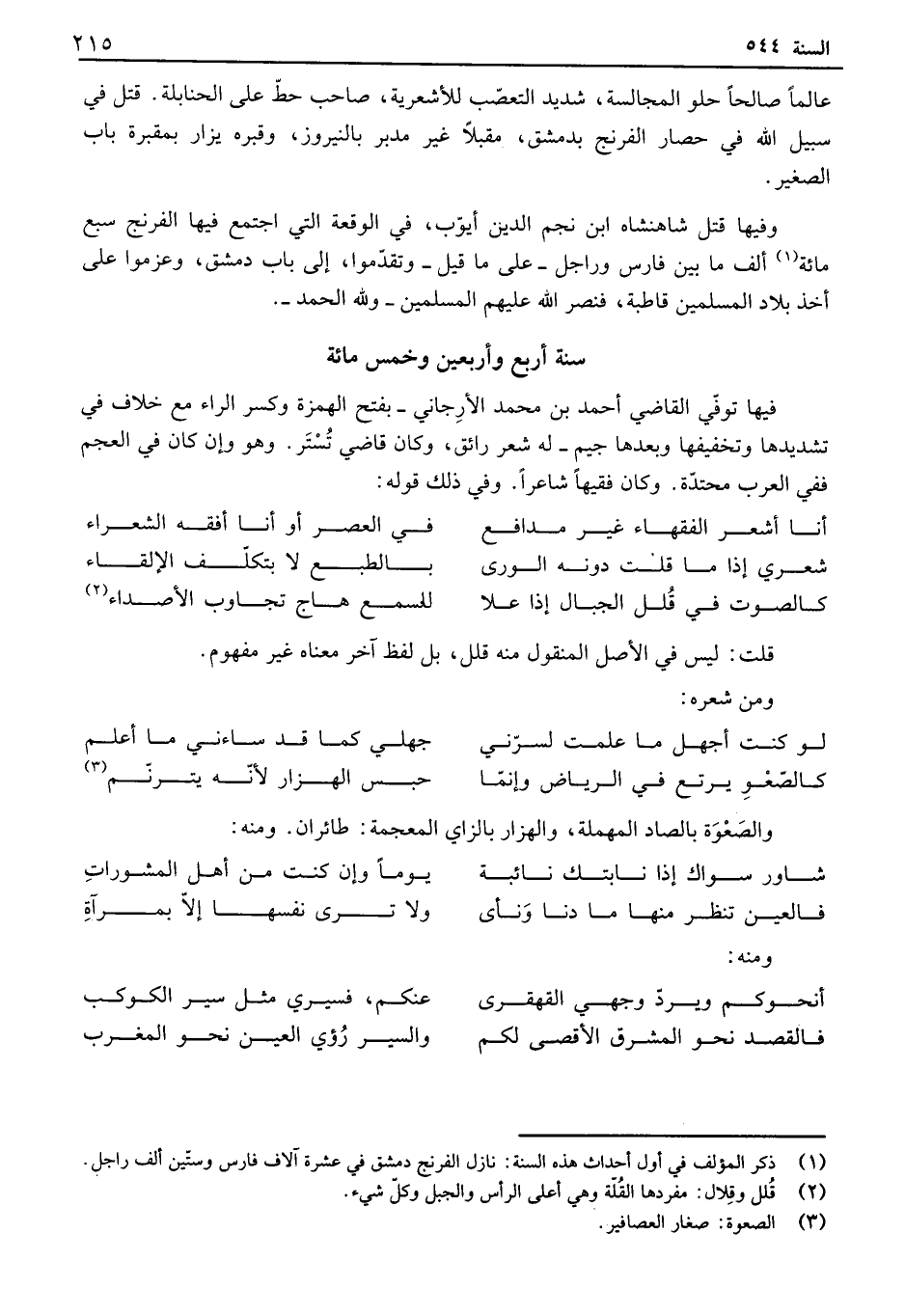 فيها توفي القاضي أحمد بن محمد الأرجاني - بفتح آلهمنة وكسر إلىاء مع خلاف في تشديدها وتخفيفها وبعدها جيم - له شعر رائق، وكان قاضي تستر. وهو وإن كان في العجم ففي العرب محتدة. وكان فقيهاً شاعراً. وفي ذلك قوله: