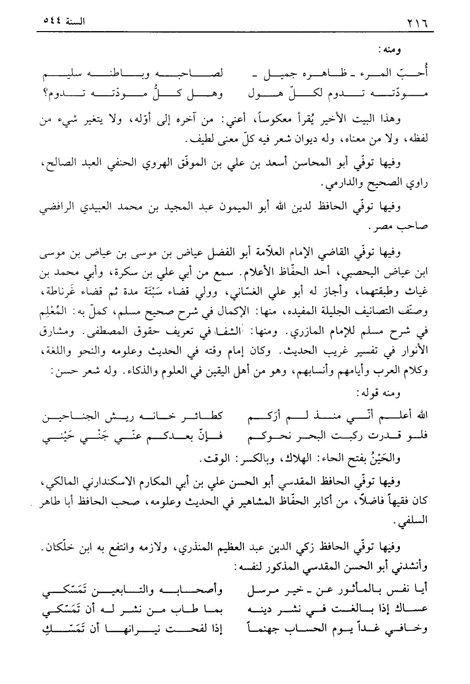 وهذا البيت الأخير يقرأ معكوساً، أعني: من آخره إلى أوله، ولا يتغير شيء من لفظه، ولا من معناه، وله ديوان شعر فيه كل معنى لطيف. وفيها توفي أبو المحاسن أسعد بن علي بن الموفق آلهروي الحنفي العبد الصالح، راوي الصحيح وألفارمي. وفيها توفي الحافظ لدين الله أبو الميمون عبد المجيد بن محمد العبيدي الرافضي صاحب مصر. وفيها توفي القاضي الإمام العلامة أبو الفضل عياض بن موسى بن عياض بن موسى ابن عياض اليحصبي، أحد الحفاظ الأعلام. سمع من أبي علي بن سكرة، وأبي محمد بن غياث وطبقتهما، وأجاز له أبو علي الغساني، وولي قضاء سبتة مدة ثم قضاء غرناطة، وصنف التصانيف الجليلة المفيده، منها: الإكمال في شرح صحيح مسلم، كمل به: المعلم في شرح مسلم للإمام ألفازري. ومنها: الشفا في تعريف حقوق المصطفى. ومشارق الأنوار في تفسير غريب الحديث. وكان إمام وقته في الحديث وعلومه والنحو واللغة، وكلام العرب وأيامهم وأنسابهم، وهو من أهل اليقين في العلوم والذكاء. وله شعر حسن: ومنه قوله: