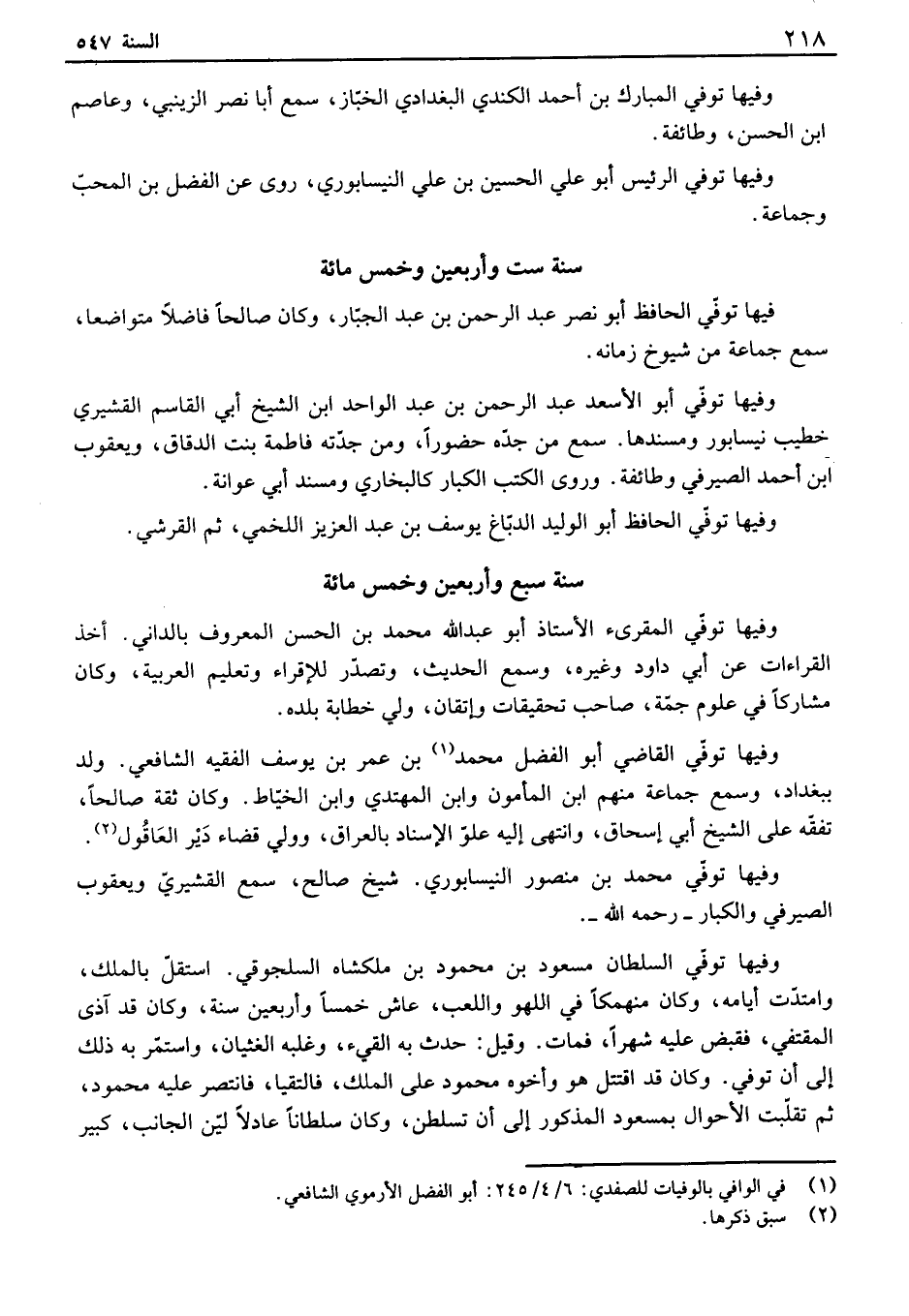 فيها توفي الحافظ أبو نصر عبد إلىحمن بن عبد الجبار، وكان صألفا فاضلاً متواضعا، سمع جماعة من شيوخ زمانه. وفيها توفي أبو الأسعد عبد إلىحمن بن عبد الواحد ابن الشيخ أبي القاسم القشيري خطيب نيسابور ومسندها. سمع من جده حضوراً، ومن جدته فاطمة بنت الدقاق، ويعقوب ابن أحمد الصيرفي وطائفة. وروى الكتب الكبار كالبخاري ومسند أبي عوانة. وفيها توفني الحافظ أبو الوليد الدباغ يوسف بن عبد العزيز اللخمي، ثم القرشي.