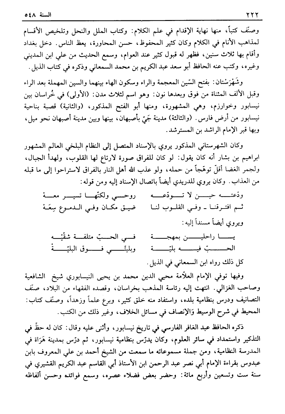 كل ذلك رواه ابن السمعاني في الذيل. وفيها توفي الإمام العلامة محيي الدين محمد بن يحيى النيسابوري شيخ الشافعية وصاحب الغزالي. انتهت إليه رئاسة المذهب بخراسان، وقصده الفقهاء من البلاد، صنف التصانيف ودرس بنظامية بلده، واستفاد منه خلق كثير، وبرع علماً وزهداً، وصنف كتاب: المحيط في شرح الوسيط والإنصاف في مسائل الخلاف، وغير ذلك من الكتب. ذكره الحافظ عبد ألفافي ألفارسي في تاريخ نيسابور، وأثنى عليه وقال: كان له حظ في التذكير واستمداد في سائر العلوم، وكان يدرس بنظامية نيسابور، ثم درس بمدينه هراة في المدرسة النظامية، ومن جملة مسموعاته ما سمعت من الشيخ أحمد بن علي المعروف بابن عبدوس بقراءة الإمام أبي نصر عبد إلىحمن ابن الأستاذ أبي القاسم عبد الكريم القشيري في سنة ست وتسعين وأربع مائة: وحضر بعض فضلاء عصره، وسمع فوائده وحسن ألفاظه
