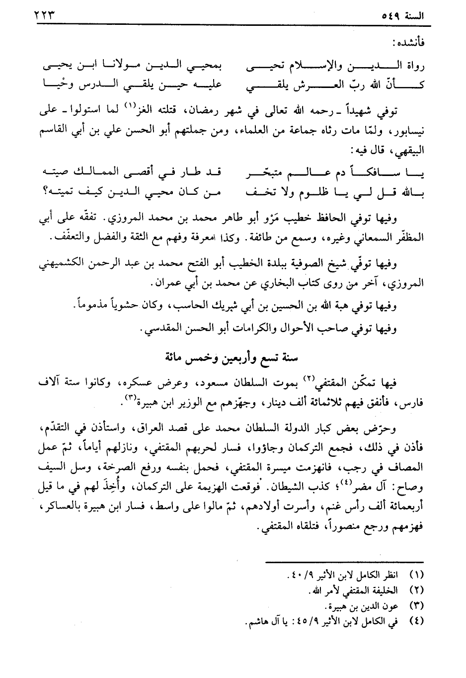 فيها تمكن المقتفي بموت السلطان مسعود، وعرض عسكره، وكانوا ستة آلاف فارس، فأنفق فيهم ثلاثمائة ألف دينار، وجهزهم مع الوزير ابن هبيرة. وحرض بعض كبار الدولة السلطان محمد على قصد العراق، واستأذن في التقدم، فأذن في ذلك، فجمع التركمان وجاؤوا، فسار لحربهم المقتفي، ونازلهم أياماً، ثم عمل المصاف في رجب، فانهزمت ميسرة المقتفي، فحمل بنفسه ورفع الصرخة، وسل السيف وصاح: آل مضر، كذب الشيطان. فوقعت آلهزيمة على التركمان، وأخذ لهم في ما قيل أربعمائة ألف رأس غنم، وأسرت أولادهم، ثم مالوا على واسط، فسار ابن هبيرة بالعساكر، فهزمهم ورجع منصوراً، فتلماه المقتفي.