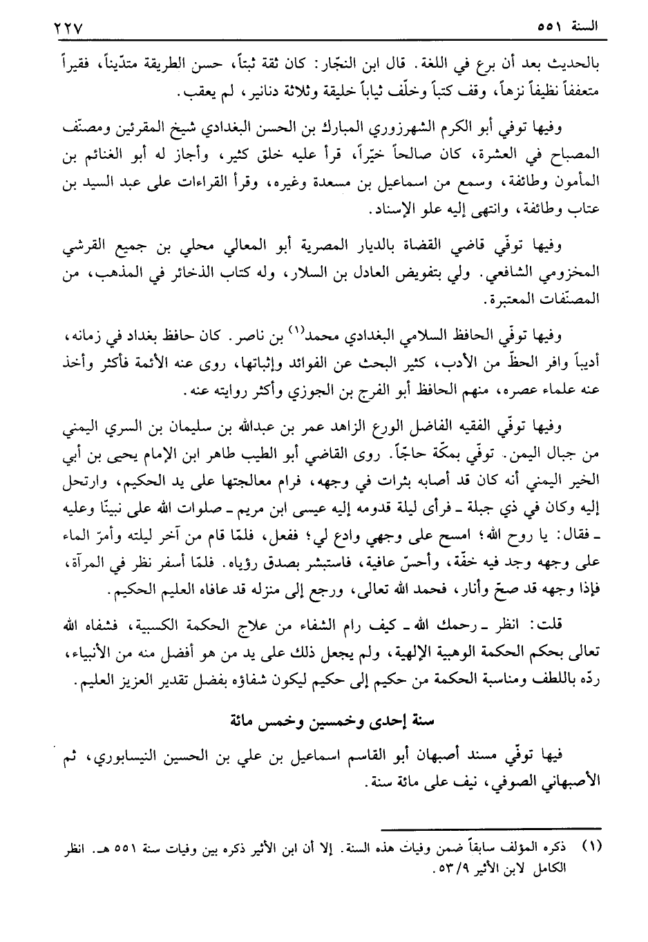 بالحديث بعد أن برع في اللغة. قال ابن النجار: كان ثقة ثبتاً، حسن الطريقة متديناً، فقير متعففاً نظيفاً نزهاً، وقف كتباًِ وخلف ثياباً خليقة وثلاثة دنانير، لم يعقب. وفيها توفي أبو الكرم الشهرزوري المبارك بن الحسن البغدادي شيخ المقرئين ومصنف المصباح في العشرة، كان صألفا خيراً، قرأ عليه خلق كثير، وأجاز له أبو الغنائم بن الشامون وطائفة، وسمع من اسماعيل بن مسعدة وغيره، وقرأ القراءات على عبد السيد بن عتاب وطائفة، وانتهى إليه علو الإسناد. وفيها توفي قاضي القضاة بالديار المصرية أبو المعالي محلي بن جميع القرشي المخزومي الشافعي. ولي بتفويض العادل بن السلار، وله كتاب الذخائر في المذهب، من المصنفات المعتبرة. وفيها توفي الحافظ السلامي البغدادي محمد بن ناصر. كان حافظ بغداد في زمانه، أديباً وافي الحظ من الأدب، كثير البحث عن الفوائد وإثباتها، روى عنه الأئمة فأكثر وأخذ عنه علماء عصره، منهم الحافظ أبو الفيج بن الجوزي وأكثر روايته عنه. وفيها توفي الفقيه ألفاضل الورع الزاهد عمر بن عبد الله بن سليمان بن السري اليمني من جبال اليمن. توفي بمكة حاجاً. روى القاضي أبو الطيب طاهر ابن الإمام يحيى بن أبي الخير اليمني أنه كان قد أصابه بثرات في وجهه، فيام معالجتها على يد الحكيم، وارتحل إليه وكان في ذي جبلة - فيأى ليلة قدومه إليه عيسى ابن مريم - صلوات الله على نبينا وعليه - فقال: يا روح الله؛ امسح على وجهي وادع ل؛ ففعل، فلما قام من آخر ليلته وأمر الماء على وجهه وجد فيه خفة، وأحس عافية، فاستبشر بصدق رؤياه. فلما أسفي نظر في المرآة، فإذا وجهه قد صح وأنار، فحمد الله تعالى، ورجع إلى منزله قد عاماه العليم الحكيم. قلت: انظر - رحمك الله - كيف رام الشفاء من علاج الحكمة الكسبية، فشفاه الله تعالى بحكم الحكمة الوهبية الآلهية، ولم يجعل ذلك على يد من هو أفضل منه من الأنبياء، رده باللطف ومناسبة الحكمة من حكيم إلى حكيم ليكون شفاؤه بفضل تقدير العزيز العليم.
