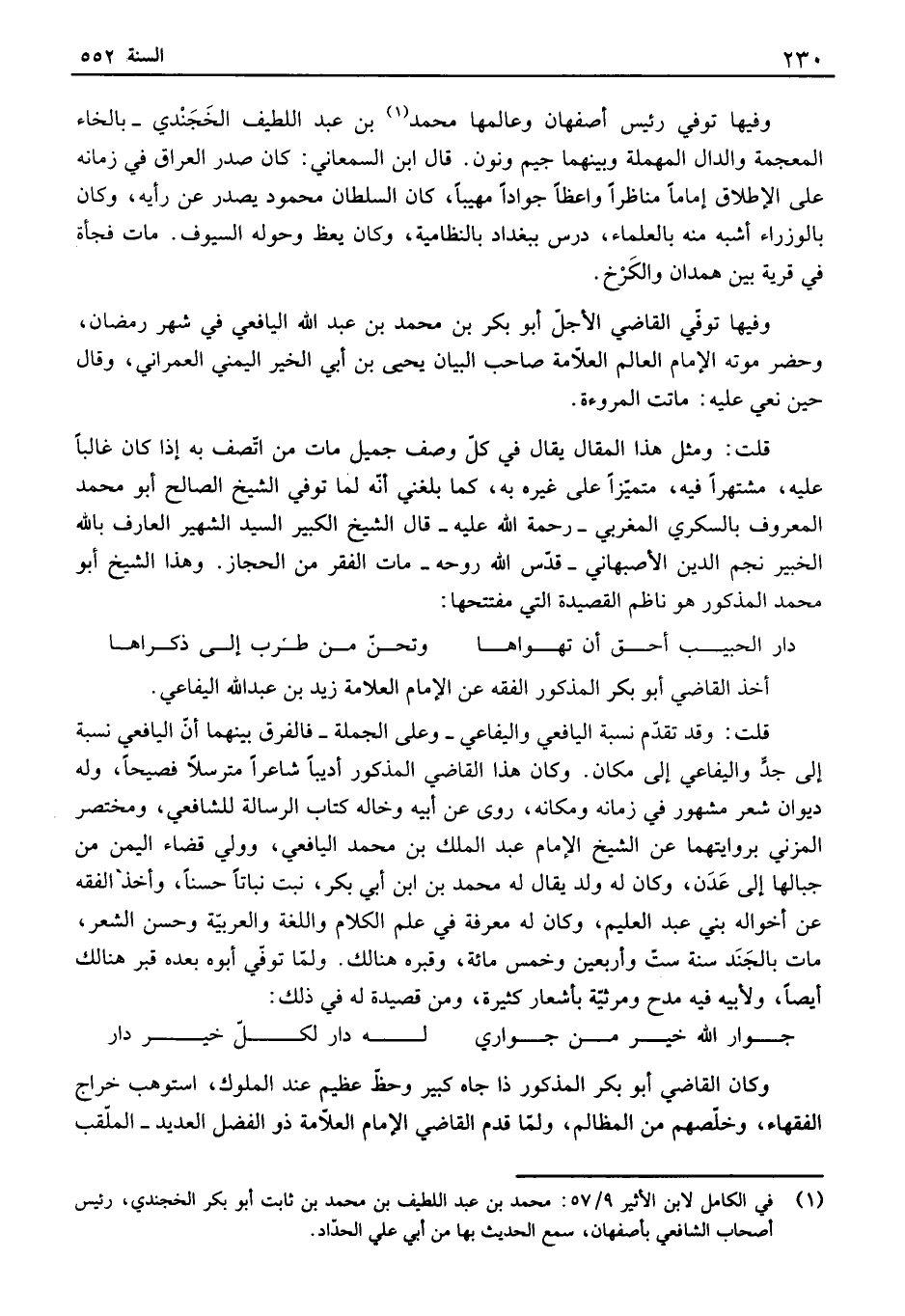وفيها توفي رئيس أصفهان وعالمها محمد بن عبد اللطيف الخجندي - بالماء المعجمة وألفال المهملة وبينهما جيم ونون. قال ابن السمعاني: كان صدر العراق في زمانه على الإطلاق إماماً مناظراً واعظاً جواداً مهيباً، كان السلطان محمود يصدر عن رأيه، وكان بالوزراء أشبه منه بالعلماء، درس ببغداد بالنظامية، وكان يعظ وحوله السيوف. مات فجأة في قرية بين همدان والكرخ. وفيها توفي القاضي الأجل أبو بكر بن محمد بن عبد الله الشافعي في شهر رمضان، وحضر موته الإمام العالم العلامة صاحب البيان يحيى بن أبي الخير اليمني العمراني، وقال حين نعي عليه: ماتت المروءة. قلت: ومثل هذا المقال يقال في كل وصف جميل مات من اتصف به إذا كان غألفا عليه، مشتهراً فيه، متميزاً على غيره به، كما بلغني أنه لما توفي الشيخ الصالح أبو محمد المعروف بالسكري المغربي - رحمة الله عليه - قال الشيخ الكبير السيد الشهير ألفارف بالله الخبير نجم الدين الأصبهاني - قدس الله روحه - مات الفقر من الحجاز. وهذا الشيخ أبو محمد المذكور هو ناظم القصيدة التي مفتتحها: