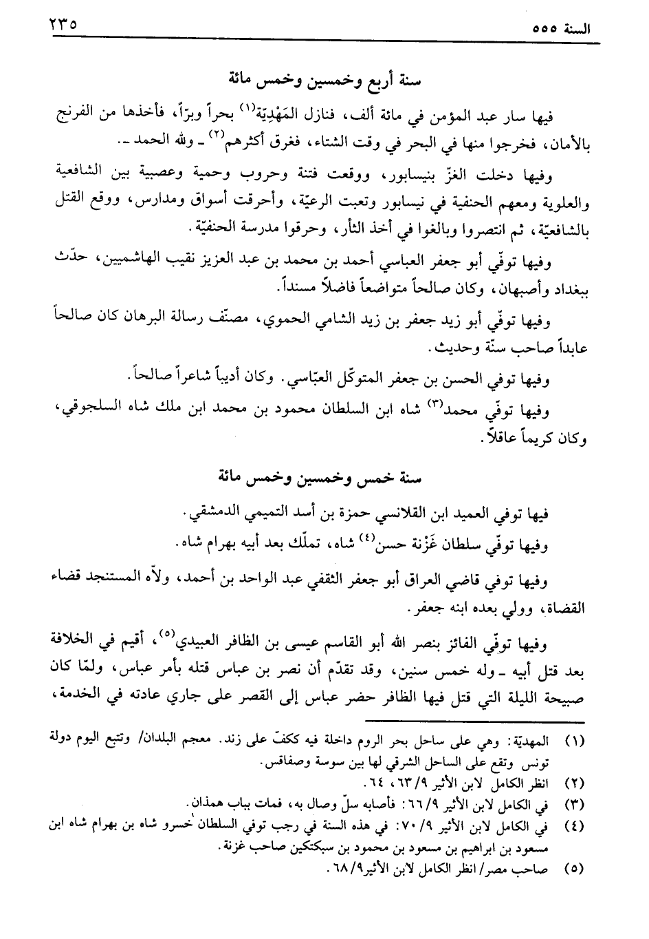 فيها سارعبد المؤمن في مائة ألف، فنازل المهدية بحراً وبراً، فأخذها من الفرنج بالأمان، فخرجوا منها في البحر في وقت الشتاء، فغرق أكثرهم - ولله الحمد -. وفيها دخلت الغز بنيسابور، ووقعت فتنة وحروب وحمية وعصبية بين الشافعية والعلوية ومعهم الحنفية في نيسابور وتعبت إلىعية، وأحرقت أسواق ومدارس، ووقع القتل بالشافعية، ثم انتصروا وبالغوا في أخذ الثأر، وحرقوا مدرسة الحنفية. وفيها توفي أبو جعفر العباسي أحمد بن محمد بن عبد العزيز نقيب آلهاشميين، حدث ببغداد وأصبهان، وكان صألفا متواضعاً فاضلاً مسنداً.