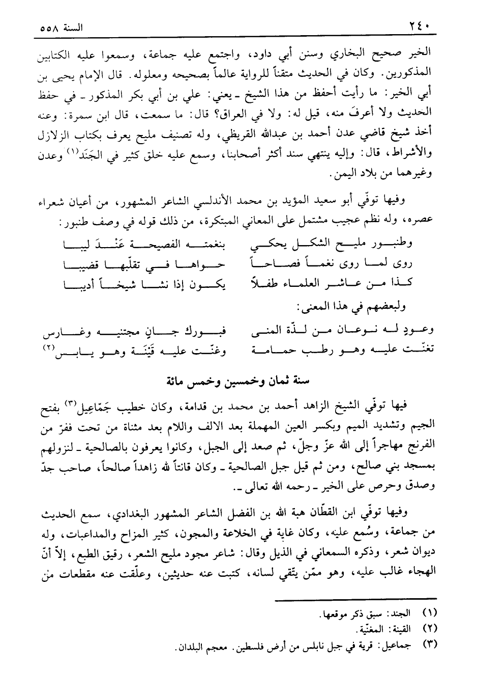 الخير صحيح البخاري وسنن أبي داود، واجتمع عليه جماعة، وسمعوا عليه الكتابين المذكورين. وكان في الحديث متقناً للرواية عألفا بصحيحه ومعلوله. قال الإمام يحيى بن أبي الخير: ما رأيت أحفظ من هذا الشيخ - يعني: علي بن أبي بكر المذكور - في حفظ الحديث ولا أعرف منه، قيل له: ولا في العراق؟ قال: ما سمعت، قال ابن سمرة: وعنه أخذ شيخ قاضي عدن أحمد بن عبد الله القريظي، وله تصنيف مليح يعرف بكتاب الزلازل والأشراط، قال: وإليه ينتهي سند أكثر أصحابنا، وسمع عليه خلق كثير في الجند وعدن وغيرهما من بلاد اليمن. وفيها توفي أبو سعيد المؤيد بن محمد الأندلسي ألفاعر المشهور، من أعيان شعراء عصره، وله نظم عجيب مشتمل على المعاني المبتكرة، من ذلك قوله في وصف طنبور: