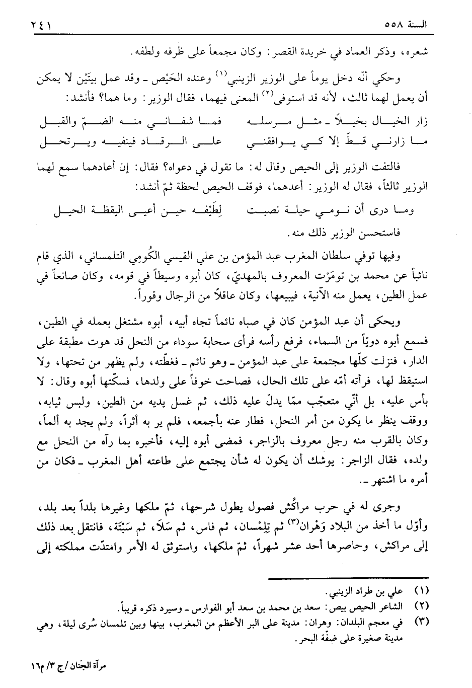 شعره، وذكر العماد في خريدة القصر: وكان مجمعاً على ظرفه ولطفه. وحكي أنه دخل يوماً على الوزير الزينبي وعنده الحيص - وقد عمل بيتين لا يمكن أن يعمل لهما ثالث، لأنه قد استوفى المعنى فيهما، فقال الوزير: وما هما؟ فأنشد: