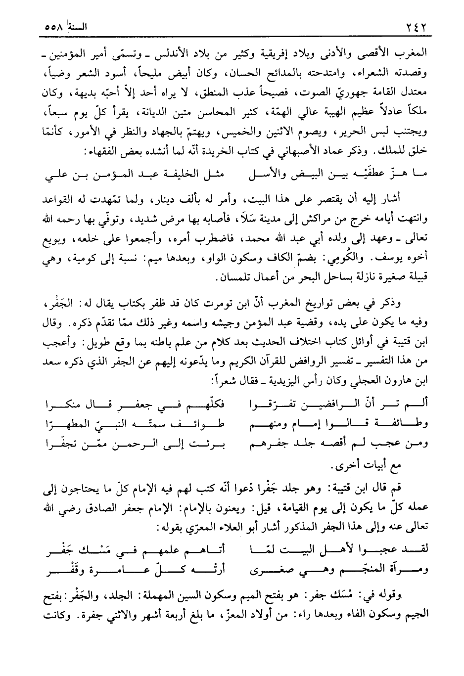 أشار إليه أن يقتصر على هذا البيت، وأمر له بألف دينار، ولما تمهدت له القواعد وانتهت أيامه خرج من مراكش إلى مدينة سلا، فأصابه بها مرض شديد، وتوفي بها رحمه الله تعالى - وعهد إلى ولده أبي عبد الله محمد، فاضطرب أمره، وأجمعوا على خلعه، وبويع أخوه يوسف. والكومي: بضم ألفاف وسكون الواو، وبعدها ميم: نسبة إلى كومية، وهي قبيلة صغيرة نازلة بساحل البحر من أعمال تلمسان. وذكر في بعض تواريخ المغرب أن ابن تومرت كان قد ظفي بكتاب يقال له: الجفي، وفيه ما يكون على يده، وقضية عبد المؤمن وجيشه واسمه وغير ذلك مما تقدم ذكره. وقال ابن قتيبة في أوائل كتاب اختلاف الحديث بعد كلام من علم باطنه بما وقع طويل: وأعجب من هذا التفسير - تفسير إلىوافض للقرآن الكريم وما يدعونه إليهم عن الجفي الذي ذكره سعد ابن هارون العجلي وكان رأس اليزيدية - فقال شعراً: