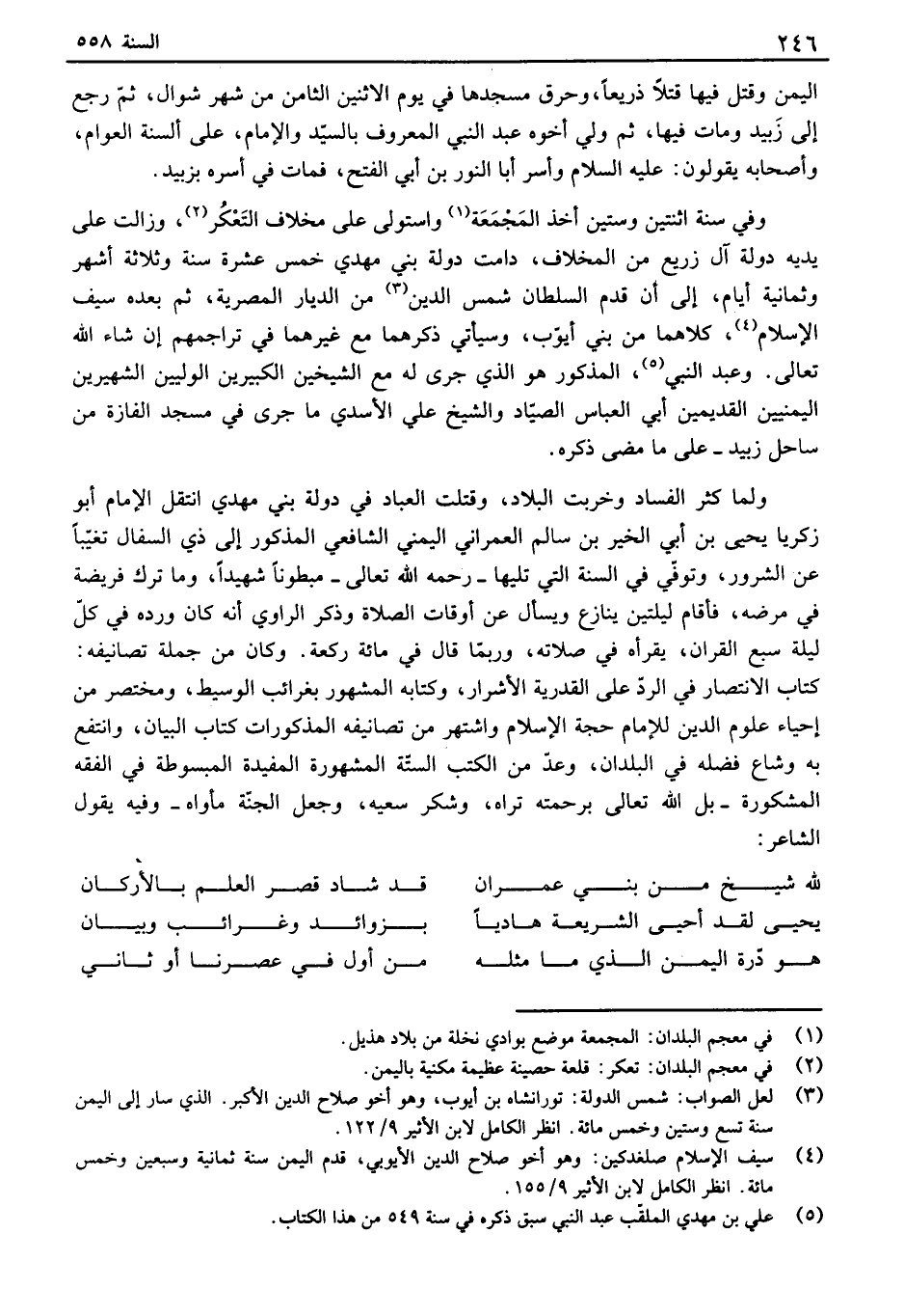 اليمن وقتل فيها قتلاً ذريعاً، وحرق مسجدها في يوم الاثنين الثامن من شهر شوال، ثم رجع إلى زبيد ومات فيها، ثم ولي أخوه عبد النبي المعروف بالسيد والإمام، على ألسنة العوام، وأصحابه يقولون: عليه السلام وأسر أبا النور بن أبي الفتح، فمات في أسره بزبيد. وفي سنة اثنتين وستين أخذ المجمعة واستولى على مخلاف التعك، وزالت على يديه دولة آل زريع من المخلاف، دامت دولة بني مهدي خمس عشرة سنة وثلاثة أشهر وثمانية أيام، إلى أن قدم السلطان شمس الدين من الديار المصرية، ثم بعده سيف الإسلا، كلاهما من بني أيوب، وسيأتي ذكرهما مع غيرهما في تراجمهم إن شاء الله تعالى. وعبد النب، المذكور هو الذي جرى له مع الشيخين الكبيرين الوليين الشهيرين اليمنيين القديمين أبي العباس الصياد والشيخ علي الأسدي ما جرى في مسجد ألفازة من ساحل زبيد - على ما مضى ذكره. ولما كثر الفساد وخربت البلاد، وقتلت العباد في دولة بني مهدي انتقل الإمام أبو زكريا يحيى بن أبي الخير بن سالم العمراني اليمني الشافعي المذكور إلى ذي السفال تغيباً عن الشرور، وتوفي في السنة التي تليها - رحمه الله تعالى - مبطوناً شهيداً، وما ترك فييضة في مرضه، فأقام ليلتين ينازع ويسأل عن أوقات الصلاة وذكر إلىاوي أنه كان ورده في كل ليلة سبع القران، يقرأه في صلاته، وربما قال في مائة ركعة. وكان من جملة تصانيفه: كتاب الانتصار في إلىد على القدرية الأشرار، وكتابه المشهور بغرائب الوسيط، ومختصر من إحياء علوم