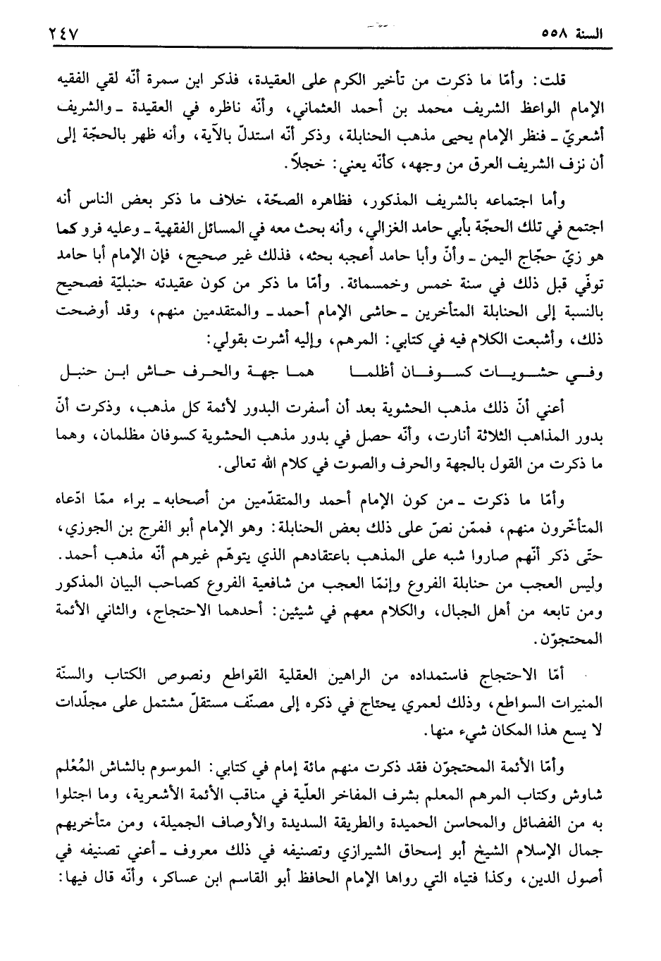 قلت: وأما ما ذكرت من تأخير الكرم على العقيدة، فذكر ابن سمرة أنه لقي الفقيه الإمام الواعظ الشريف محمد بن أحمد العثماني، وأنه ناظره في العقيدة - والشريف أشعري - فنظر الإمام يحيى مذهب الحنابلة، وذكر أنه استدل بالآية، وأنه ظهر بالحجة إلى أن نزف الشريف العرق من وجهه، كأنه يعني: خجلاً. وأما اجتماعه بالشريف المذكور، فظاهره الصحة، خلاف ما ذكر بعض الناس أنه اجتمع في تلك الحجة بأبي حامد الغزالي، وأنه بحث معه في المسائل الفقهية - وعليه فيو كما هو زي حجاج اليمن - وأن وأبا حامد أعجبه بحثه، فذلك غير صحيح، فإن الإمام أبا حامد توفي قبل ذلك في سنة خمس وخمسمائة. وأما ما ذكر من كون عقيدته حنبلية فصحيح بالنسبة إلى الحنابلة المتأخرين - حاشى الإمام أحمد - والمتقدمين منهم، وقد أوضحت ذلك، وأشبعت الكلام فيه في كتابي: المرهم، وإليه أشرت بقولي: