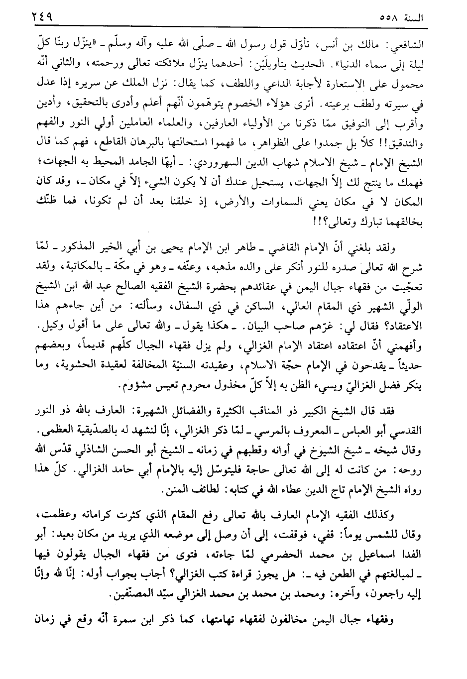 أترى هؤلاء الخصوم يتوهمون أنهم أعلم وأدرى بالتحقيق، وأدين وأقرب إلى التوفيق مما ذكرنا من الأولياء العارفين، والعلماء الشاملين أولي النور والفهم والتدقيق!! كلا بل جمدوا على الظواهر، ما فهموا استحالتها بالبرهان ألفاطع، فهم كما قال الشيخ الإمام - شيخ الاسلام شهاب الدين السهروردي: - أيها الشامد المحيط به الجهات؛ فهمك ما ينتج لك إلا الجهات، يستحيل عندك أن لا يكون الشيء إلا في مكان -، وقد كان المكان لا في مكان يعني السماوات والأرض، إذ خلقنا بعد أن لم تكونا، فما ظنك بخالقهما تبارك وتعالى؟!! ولقد بلغني أن الإمام القاضي - طاهر ابن الإمام يحيى بن أبي الخير المذكور - لما شرح الله تعالى صدره للنور أنكر على والده مذهبه، وعنفه - وهو في مكة - بالمكاتبة، ولقد تعجبت من فقهاء جبال اليمن في عقائدهم بحضرة الشيخ الفقيه الصالح عبد الله ابن الشيخ الولي الشهير ذي المقام ألفالي، ألفاكن في ذي السفال، وسألته: من أين جاءهم هذا الاعتقاد؟ فقال لي: غرهم صاحب البيان. - هكذا يقول - والله تعالى على ما أقول وكيل. وأفهمني أن اعتقاده اعتقاد الإمام الغزالي، ولم يزل فقهاء الجبال كلهم قديماً، وبعضهم حديثاً - يقدحون في الإمام حجة الاسلام، وعقيدته السنية المخالفة لعقيدة الحشوية، وما ينكر فضل الغزالي ويسيء الظن به إلا كل مخذول محروم تعيس مشؤوم. فقد قال الشيخ الكبير ذو المناقب الكثيرة والفضائل الشهيرة: ألفارف بالله ذو النور القدسي أبو العباس - المعروف بالمرسي - لما ذكر الغزالي، إنا لنشهد له بالصديقية العظمى. وقال شيخه - شيخ الشيوخ في أوانه وقطبهم في زمانه - الشيخ أبو الحسن ألفاذلي قدس الله روحه: من كانت له إلى الله تعالى حاجة فليتوسل إليه بالإمام أبي حامد الغزالي. كل هذا رواه الشيخ الإمام تاج الدين عطاء الله في كتابه: لمائف المنن. وكذلك الفقيه الإمام ألفارف بالله تعالى رفع المقام الذي كثرت كراماته وعظمت، وقال للشمس يوماً: قفي، فوقفت، إلى أن وصل إلى موضعه الذي يريد من مكان بعيد: أبو الفدا اسماعيل بن محمد الحضرمي لما جاءته، فتوى من فقهاء الجبال يقولون فيها - لمبالغتهم في الطعن فيه -: هل يجوز قراءة كتب الغزالي؟ أجاب بجواب أوله: إنا لله وإنا إليه راجعون، وآخره: ومحمد بن محمد بن محمد الغزالي سيد المصنفين. وفقهاء جبال اليمن مخالفون لفقهاء تهامتها، كما ذكر ابن سمرة أنه وقع في زمان