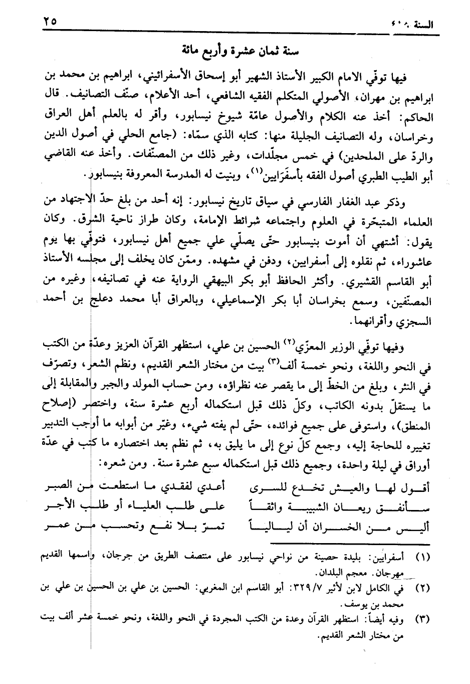 فيها توفي الإمام الكبير الأستاذ الشهير أبو إسحاق الأسفرائيني، ابراهيم بن محمد بن ابراهيم بن مهران، الأصولي المتكلم الفقيه الشافعي، أحد الأعلام، صنف التصانيف. قال الحاكم: أخذ عنه الكلام والأصول عامة شيوخ يسابور، وأقر له بالعلم أهل العراق وخراسان، وله التصانيف الجليلة منها: كتابه الذي سماه: جامع الحلي في أصول الدين والرد على الملحدين في خمس مجلدات، وغير ذلك من المصنفات. وأخذ عنه القاضي أبو الطيب الطبري أصول الفقه بأسفرايين، وبنيت له المدرسة المعروفة بنيسابور. وذكر عبد الغفار الفارسي في سياق تاريخ نيسابور: إنه أحد من بلغ حد الاجتهاد من العلماء المتبحرة في العلوم واجتماعه شرائط الإمامة، وكان طراز ناحية الشرق. وكان يقول: أشتهي أن أموت بنيسابور حتى يصفي علي جميع أهل نيسابور، فتوفي بها يوم عاشوراء، ثم نقلوه إلى أسفرايين، ودفن في مشهده. وممن كان يخلف إلى مجلسه الأستاذ أبو القاسم القشيري. وأكثر الحافظ أبو بكر البيهقي الرواية عنه في تصانيفه، وغيره من المصنفين، وسمع بخراسان أبا بكر الإسماعيلي، وبالعراق أبا محمد دعلج بن أحمد السجزي وأقرانهما. وفيها توفي الوزير المعزي الحسين بن علي، استظهر القرآن العزيز وعدة من الكتب في النحو واللغة، ونحو خمسة ألف بيت من مختار الشعر القديم، ونظم الشعر، وتصرف في النثر، وبلغ من الخط إلى ما يقصر عنه نظراؤه، ومن حساب المولد والجبر والمقابلة إلى ما يستقل بدونه الكاتب، وكل ذلك قبل استكماله أربع عشرة سنة، واختصر إصلاح المنطق، واستوفى على جميع فوائده، حتى لم يفته شيء، وغير من أبوابه ما أوجب التدبير تغييره للحاجة إليه، وجمع كل نوع إلى ما يليق به، ثم نظم بعد اختصاره ما كتب في عدة أوراق في ليلة واحدة، وجميع ذلك قبل استكماله سبع عشرة سنة. ومن شعره: