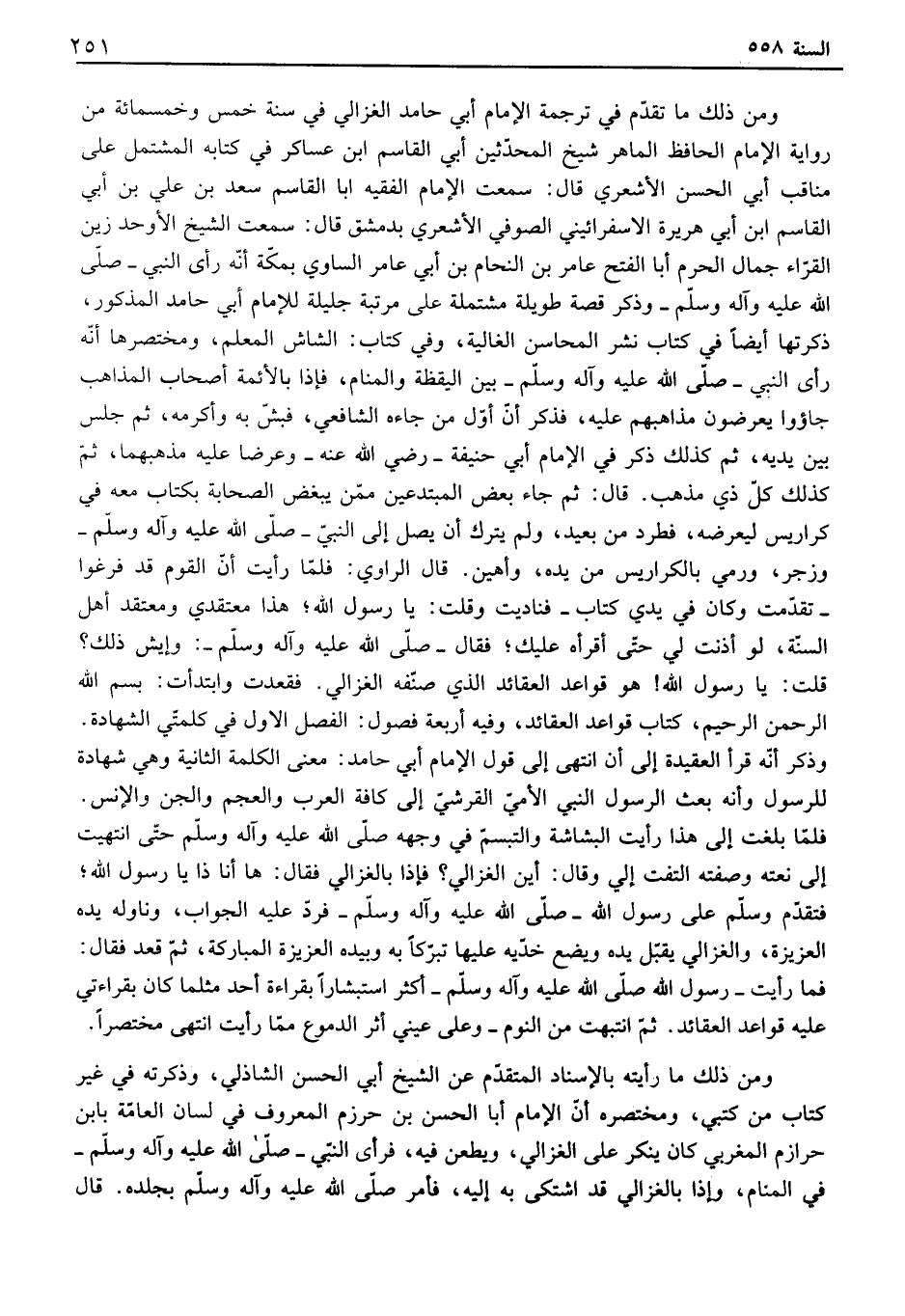 فقعدت وابتدأت: بسم الله إلىحمن الرحيم، كتاب قواعد العقائد، وفيه أربعة فصول: الفصل الاول في كلمتي الشهادة. وذكر أنه قرأ العقيدة إلى أن انتهى إلى قول الإمام أبي حامد: معنى الكلمة الثانية وهي شهادة للرسول وأنه بعث إلىسول النبي الأمي القرشي إلى كافة العرب والعجم والجن والإنس. فلما بلغت إلى هذا رأيت البشاشة والتبسم في وجهه صلى الله عليه وآله وسلم حتى انتهيت إلى نعته وصفته التفت إلي وقال: أين الغزالي؟ فإذا بالغزالي فقال: ها أنا ذا يا رسول الله؛ فتقدم وسلم على رسول الله - صلى الله عليه وآله وسلم - فيد عليه الجواب، وناوله يده العزيزة، والغزالي يقبل يده ويضع خديه عليها تبركاً به وبيده العزيزة المباركة، ثم قعد فقال: فما رأيت - رسول الله صلى الله عليه وآله وسلم - أكثر استبشاراً بقراءة أحد مثلما كان بقراءتي عليه قواعد العقائد. ثم انتبهت من النوم - وعلى عيني أثر الدموع مما رأيت انتهى مختصراً. ومن ذلك ما رأيته بالإسناد المتقدم عن الشيخ أبي الحسن ألفاذلي، وذكرته في غير كتاب من كتبي، ومختصره أن الامام أبا الحسن بن حرزم المعروف في لمان الشامة بابن حرازم المغربي كان ينكر على الغزالي، ويطعن فيه، فيأى النبي - صلى الله عليه وآله وسلم - في المنام، وإذا بالغزالي قد اشكى به إليه، فأمر صلى الله عليه وآله وسلم بجلده. قال