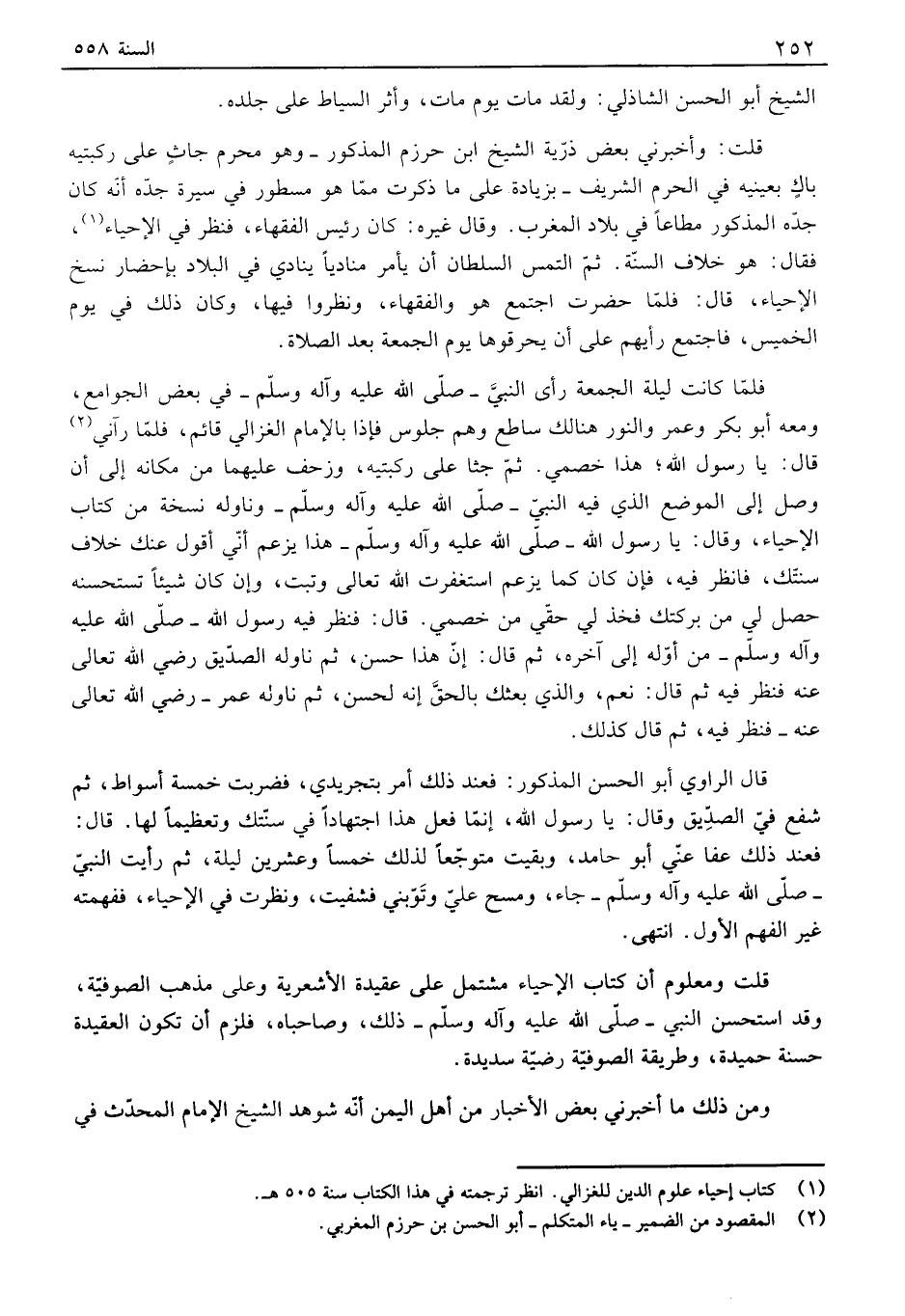 الشيخ أبو الحسن ألفاذلي: ولقد مات يوم مات، وأثر السياط على جلده. قلت: وأخبرني بعض ذرية الشيخ ابن حرزم المذكور - وهو محرم جاث على ركبتيه باك بعينيه في الحرم الشريف - بزيادة على ما ذكرت مما هو مسطور في سيرد جده أنه كان جده المذكور مطاعاً في بلاد المغرب. وقال غيره: كان رئيس الفقهاء، فنظر في الإحيا، فقال: هو خلاف السنة. ثم التمس السلطان أن يأمر منادياً ينادي في البلاد بإحضار نسخ الإحياء، قال: فلما حضرت اجتمع هو والفقهاء، ونظروا فيها، وكان ذلك في يوم الخميس، فاجتمع رأيهم على أن يحرقوها يوم الجمعة بعد الصلاة. فلما كانت ليلة الجمعة رأى النبيً - صلى الله عليه وآله وسلم - في بعض الجوامع، ومعه أبو بكر وعمر والنور هنالك ساطع وهم جلوس فإذا بالإمام الغزالي قائم، فلما رآني قال: يا رسول الله؛ هذا خصمي. ثم جثا على ركبتيه، وزحف عليهما من مكانه إلى أن وصل إلى الموضع الذي فيه النبي - صلى الله عليه وآله وسلم - وناوله نسخة من كتاب الإحياء، وقال: يا رسول الله - صلى الله عليه وآله وسلم - هذا يزعم أني أقول عنك خلاف سنتك، فانظر فيه، فإن كان كما يزعم استغفرت الله تعالى وتبت، وإن كان شيئاً تستحسنه حصل لي من بركتك فخذ لي حقي من خصمي. قال: فنظر فيه رسول الله - صلى الله عليه وآله وسلم - من أوله إلى آخره، ثم قال: إن هذا حسن، ثم ناوله الصديق رضي الله تعالى عنه فنظر فيه ثم قال: نعم، والذي بعثك بالحق إنه لحسن، ثم ناوله عمر - رضي الله تعالى عنه - فنظر فيه، ثم قال كذلك. قال إلىاوي أبو الحسن المذكور: فعند ذلك أمر بتجريدي، فضربت خمسة أسواط، ثم شفع في الصديق وقال: يا رسول الله، إنما فعل هذا اجتهاداً في سنتك وتعظيماً لها. قال: فعند ذلك عفا عني أبو حامد، وبقيت متوجعاً لذلك خمساً وعشرين ليلة، ثم رأيت النبي - صلى الله عليه وآله وسلم - جاء، ومسح علي وتوبني فشفيت، ونظرت في الإحياء، ففهمته غير الفهم الأول. انتهى. قلت ومعلوم أن كتاب الإحياء مشتمل على عقيدة الأشعرية وعلى مذهب الصوفية، وقد استحسن النبي - صلى الله عليه وآله وسلم - ذلك، وصاحباه، فلزم أن تكون العقيدة حسنة حميدة، وطريقة الصوفية رضية سديدة.