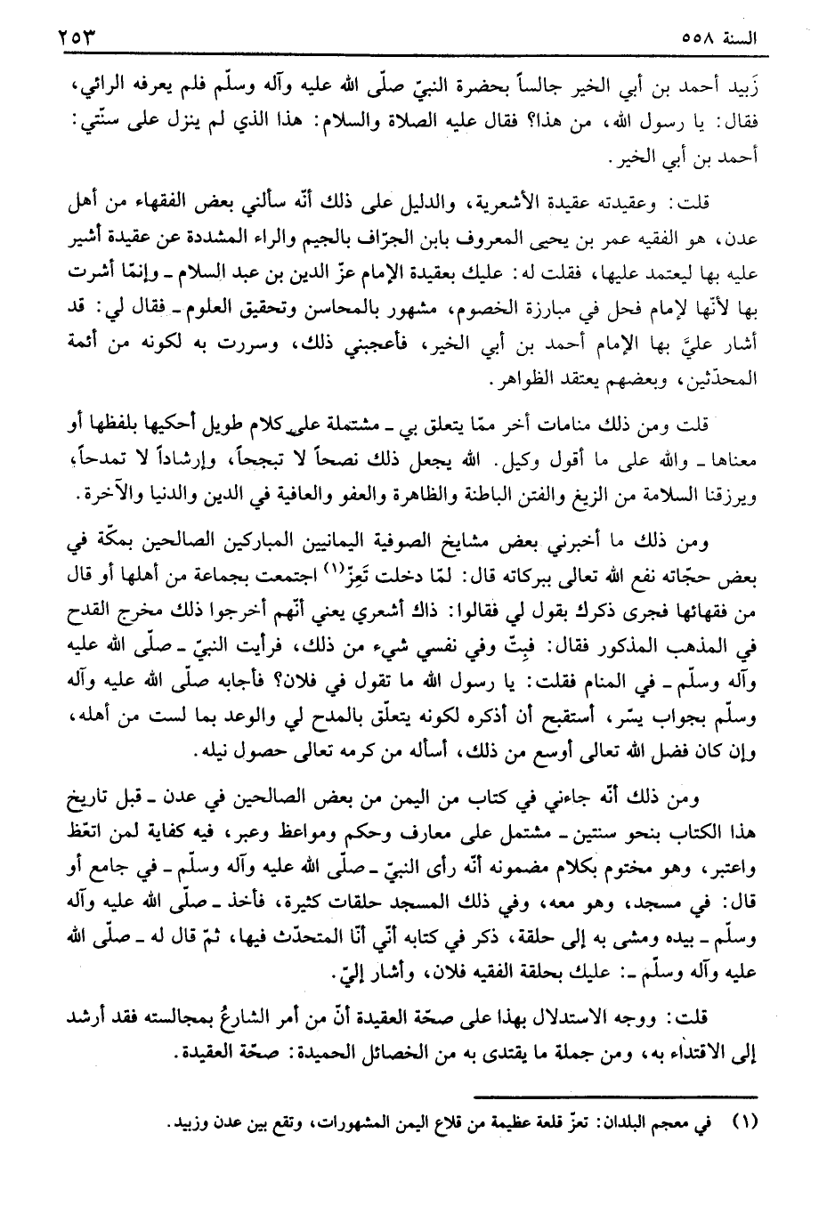 زبيد أحمد بن أبي الخير جألفا بحضرة النبي صلى الله عليه وآله وسلم فلم يعرفه إلىائي، فقال: يا رسول الله، من هذا؟ فقال عليه الصلاة والسلام: هذا الذي لم ينزل على سنتي: أحمد بن أبي الخير. قلت: وعقيدته عقيدة الأشعرية، والدليل على ذلك أنه سالني بعض الفقهاء من أهل عدن، هو الفقيه عمر بن يحيى المعروف بابن الجراف بالجيم وإلىاء المشددة عن عقيدة أشير عليه بها ليعتمد عليها، فقلت له: عليك بعقيدة الإمام عز الدين بن عبد السلام - وإنما أشرت بها لأنها لإمام فحل في مبارزة الخصوم، مشهور بالمحاسن وتحقيق العلوم - فقال لي: قد أشارعلي بها الإمام أحمد بن أبي الخير، فأعجبني ذلك، وسررت به لكونه من أئمة المحدثين، وبعضهم يعتقد الظواهر.